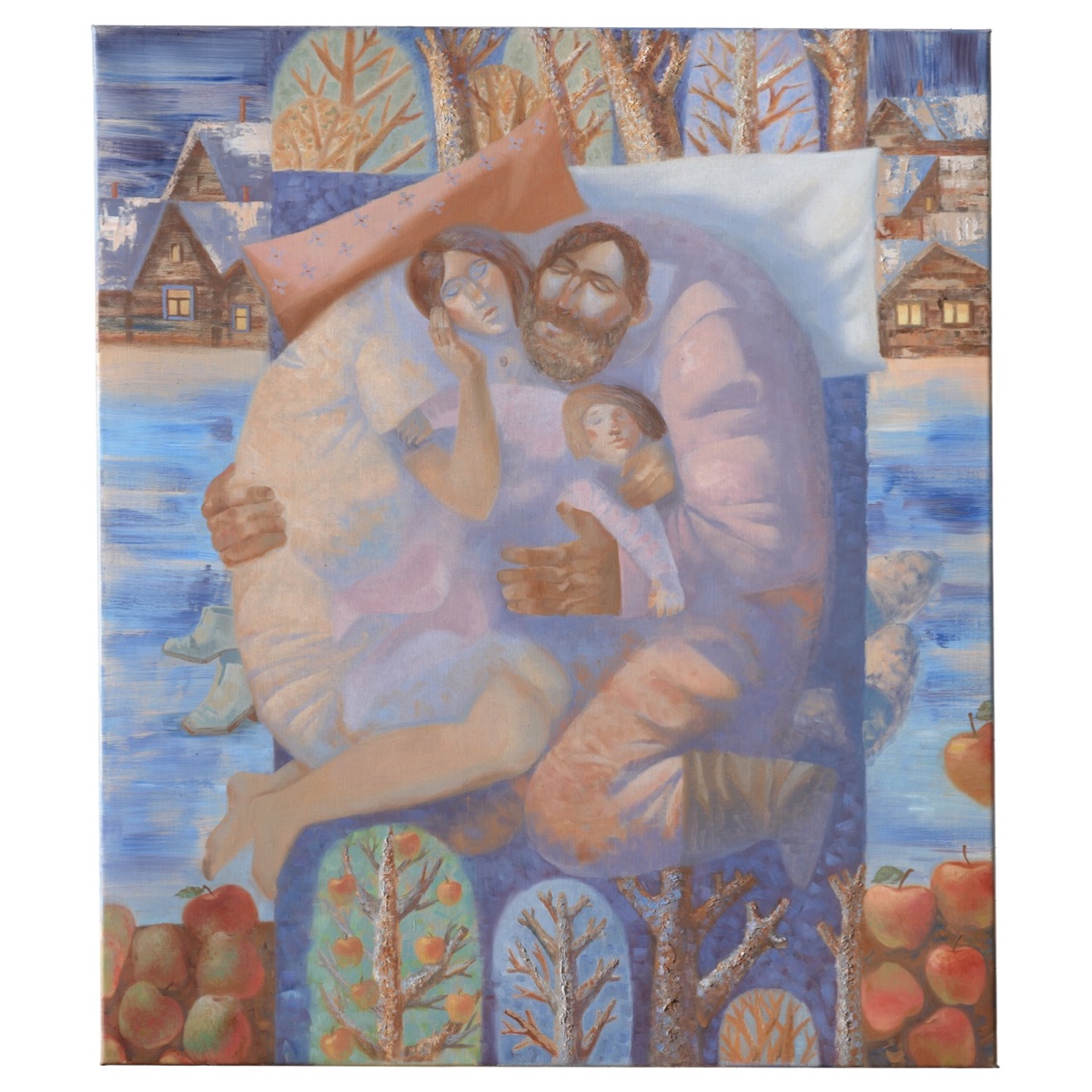 Сюжет очень популярен среди художников многих веков, несмотря на краткость его упоминания в Евангелии. Суть в том, что Святое Семейство бежит в Египет, чтобы избежать избиения младенцев по приказу царя Ирода. Целью многих художников, обращавшихся к этому сюжету, было передать смену эмоций — от тревоги и беспокойства к умиротворению и покою. В моем случае сюжет является лишь отправной точкой для рассуждения на тему семьи и дома. Спокойствие и умиротворение, безопасность и защита — вот основные эмоции, заложенные в картине. Симметрично размещенные вокруг центра фигуры создают ощущение равновесия и гармонии. На лицах — спокойствие и умиротворение; на заднем плане — деревенские домики, которые символизируют безопасность и уют. Яблоки как символ надежды и благополучия, а весь силуэт семьи, если присмотреться, тоже напоминает две половинки яблока. Теплые, мягкие цвета создают доброжелательную атмосферу. Замкнутый силуэт, напоминающий яблоко, как бы заключает внутри себя фигуры и говорит нам о том, что неважно, что снаружи, — главное всегда внутри: его надо хранить и оберегать.