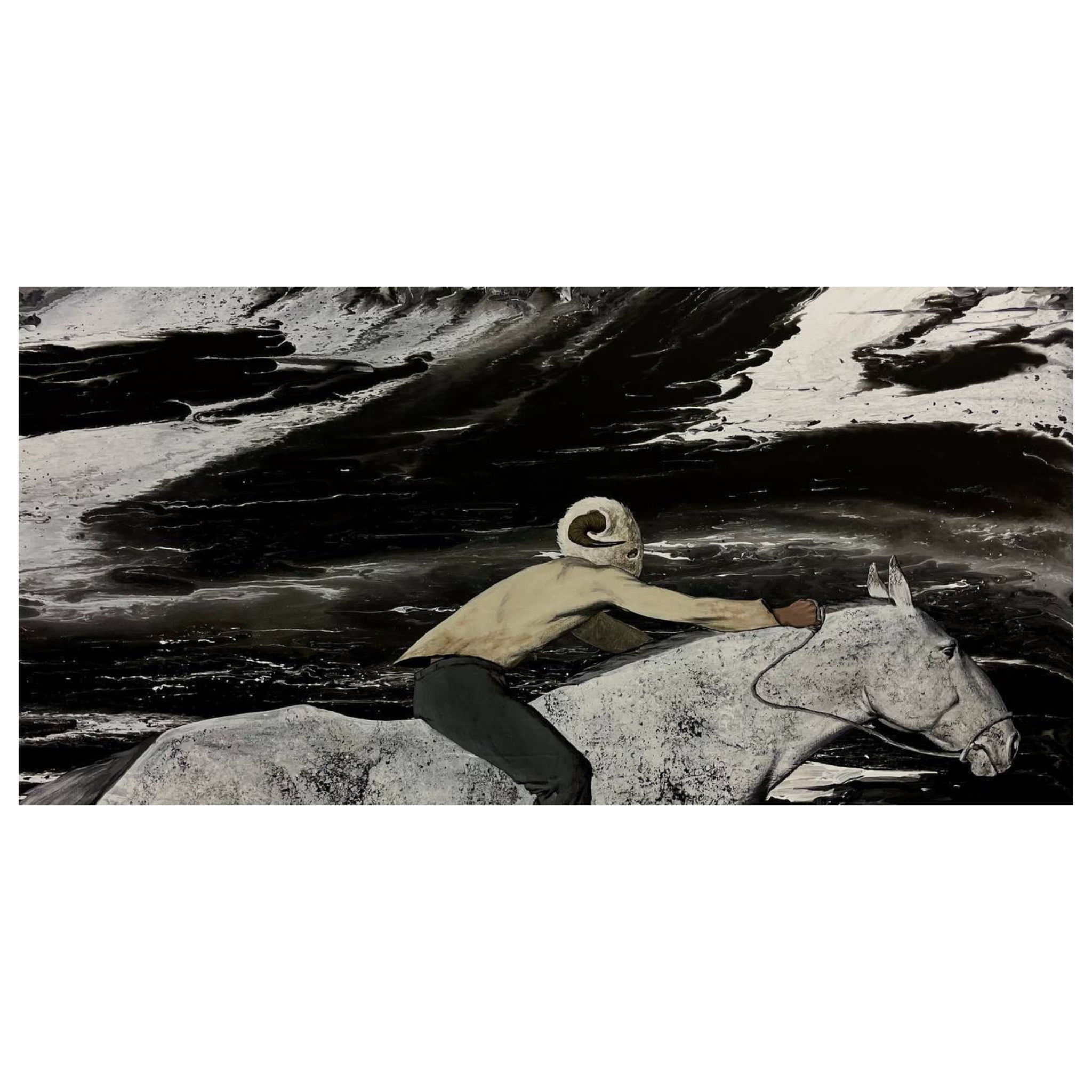 Холст в сдержанной чёрно-белой гамме, где фон напоминает текучие слои ночного неба или бурного моря. На переднем плане — фигура всадника: человеческое тело и голова барана с закрученными рогами. Он прижат к шее белой лошади, линия их движения стремительна и напряжена. Контраст гладких разводов фона и шероховатой фактуры коня усиливает динамику сцены. Образ соединяет миф и реальность, раскрывая темы инстинкта, упрямства и единства человека с природной стихией. Произведение оставляет ощущение пути сквозь тьму — туда, где решимость сильнее бури.