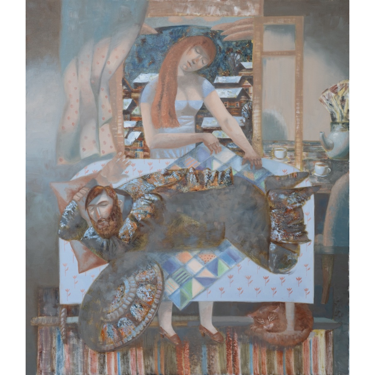 Тихий спокойный вечер. Мужчина-защитник в латах, со щитом и мечом, вернулся домой. Его ждут отдых и покой. Кот символизирует его настроение: он уютно устроился в детской колыбельке. Возможно, девушка даже тихо поёт ему. Это место силы для сильного духом. Девушка как будто защищает защитника — того, кто обычно сам является героем. Этим сюжетом я стремилась передать чувство доброты, заботы, нежности. Картина — о том, как кто восполняет свой ресурс и заряжает «батарейки». О паузе на пути. Давайте делать паузы в пути, Смотреть вокруг внимательно и строго, Чтобы случайно дважды не пройти Одной и той неверною дорогой. Давайте делать паузы в пути. А.Макаревич.