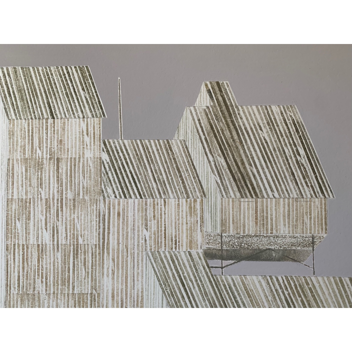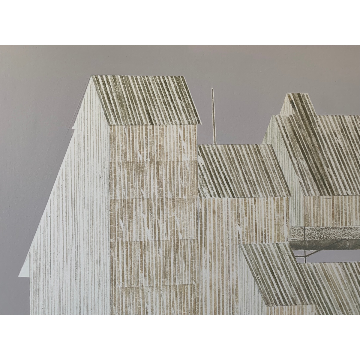 Работа из серии «Далеко-близко». «Героями» работ выступают индустриальные и сельские здания. Упрощая в изображении формы этих построек и используемую палитру, Мария подчеркивает неумышленную красоту зданий, имеющих в первую очередь функциональную природу. Она намеренно отказывается от деталей, фокусируясь на ритме, красоте геометрических фигур и пропорций. В серии эти балансирующие на грани фигуративности и абстракции работы как будто образуют архитектурный ансамбль, постепенно раскрывающийся зрителю. Серия складывается и воспринимается как маршрут, где отдельные работы становятся точками остановки.