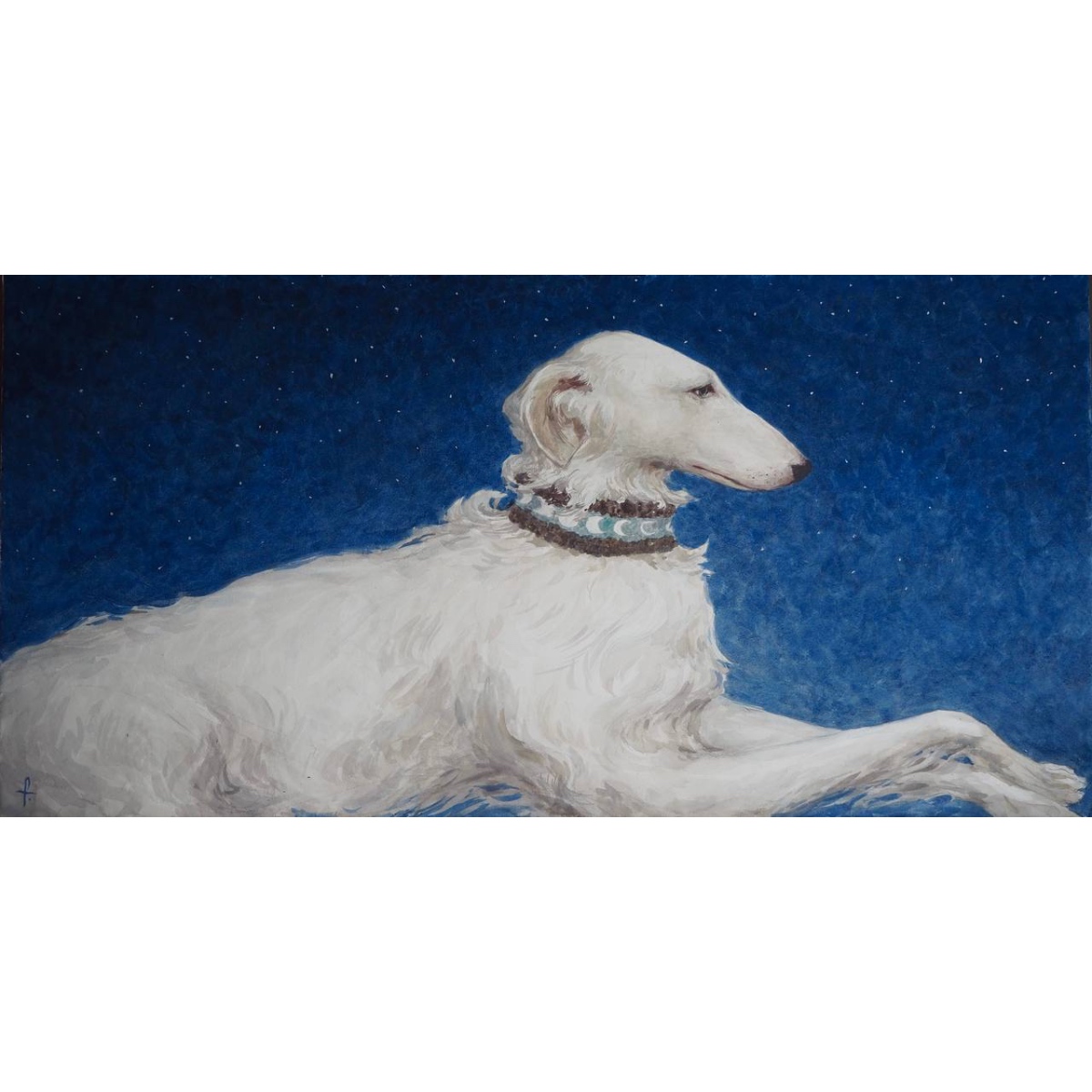 Серия работ, посвящённая борзым на синем небе, исследует образ движения и покоя одновременно. На этих картинах борзые становятся не просто животными, а символами тонкой внутренней тишины и метафорой внутренней свободы. Глубокий синий фон создаёт ощущение пространства, где время будто приостанавливается. Цвет неба в серии становится эмоциональным полем, в котором открывается связь между интуицией, ясностью и спокойствием. На этом фоне борзые читаются как проводники: они уводят взгляд вглубь, туда, где рождается ощущение тишины и доверия миру. Серия картин обращается к теме созерцательности. Художник показывает, что красота может быть тихой, честной и не требующей объяснений. Через образ борзой возникает идея о том, что движение может быть медитативным, а покой - наполненным.