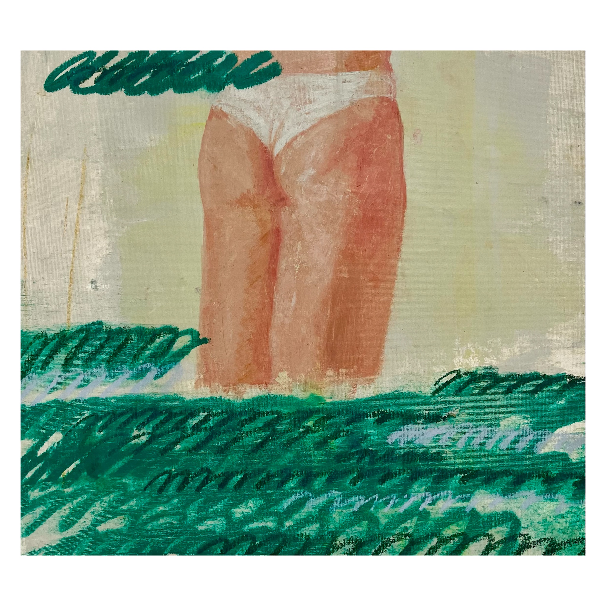 Здесь мне хотелось больше поработать с реалистичными элементами и абстрактной ритмикой. Ноги, стоящие в воде, считываются быстро, а вот сама вода — это уже повод для размышлений. У каждого зрителя может быть своя интерпретация, и в этом для меня рождается диалог. Я снова использую "морскую спираль" — символ, который часто появляется в моих работах. Он очень простой, но воспринимается по-разному и не требует однозначного прочтения.