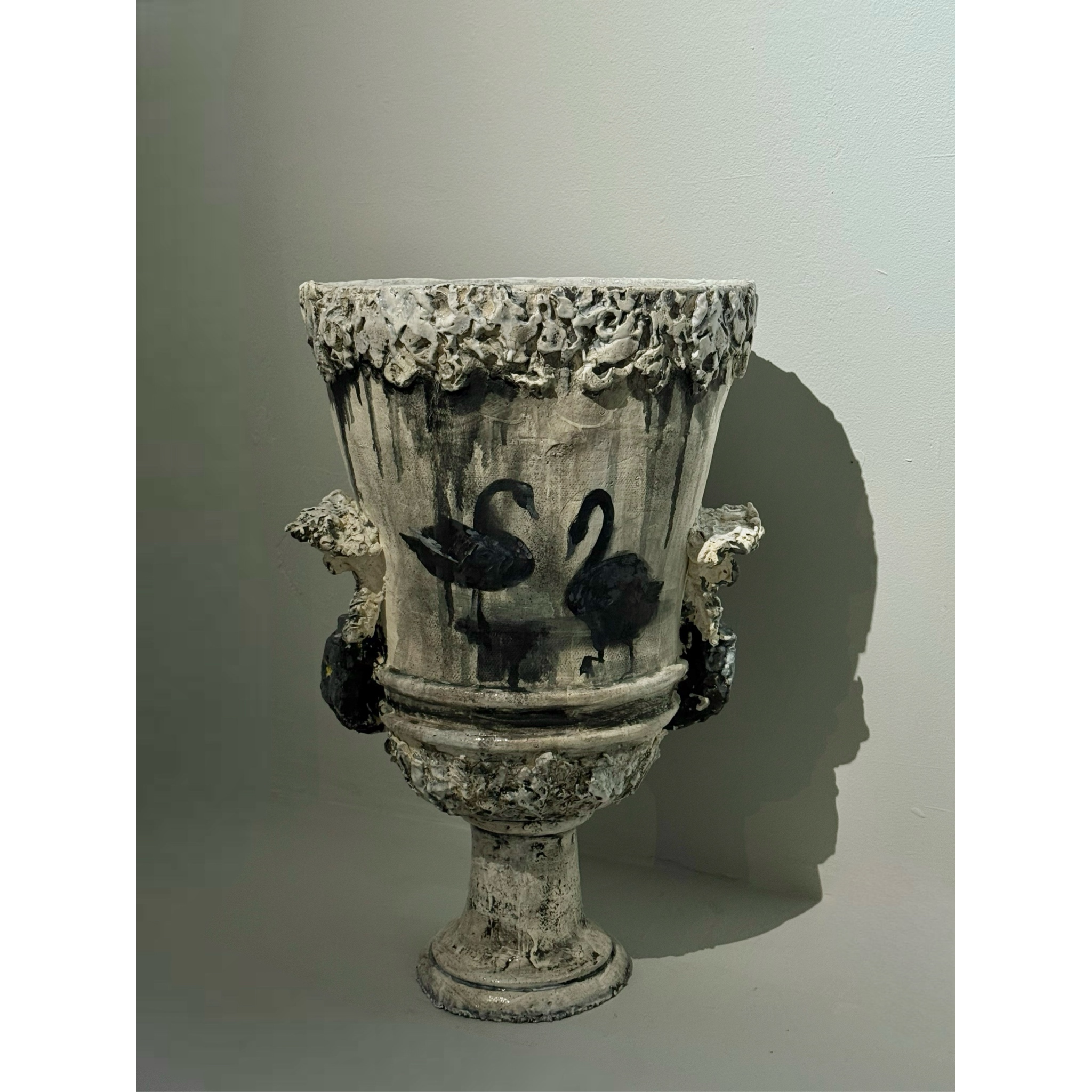 Работа из проекта Marinus. Узнаваемый образ в творчестве Анны Канфер – мотивы парадных залов и бесконечных извилистых коридоров, отсылающие к атмосфере дореволюционных особняков. В проекте Marinus этот образ трансформируется: стены коридоров распахиваются, открывая взгляду простор и море. Руины перестают быть символом разрушения – они превращаются в своеобразные окна, через которые можно увидеть бескрайний морской горизонт. Герои картин – объекты памяти и проводники вне времени; художница также отобразила их в керамике, сделав более осязаемыми для зрителя.
