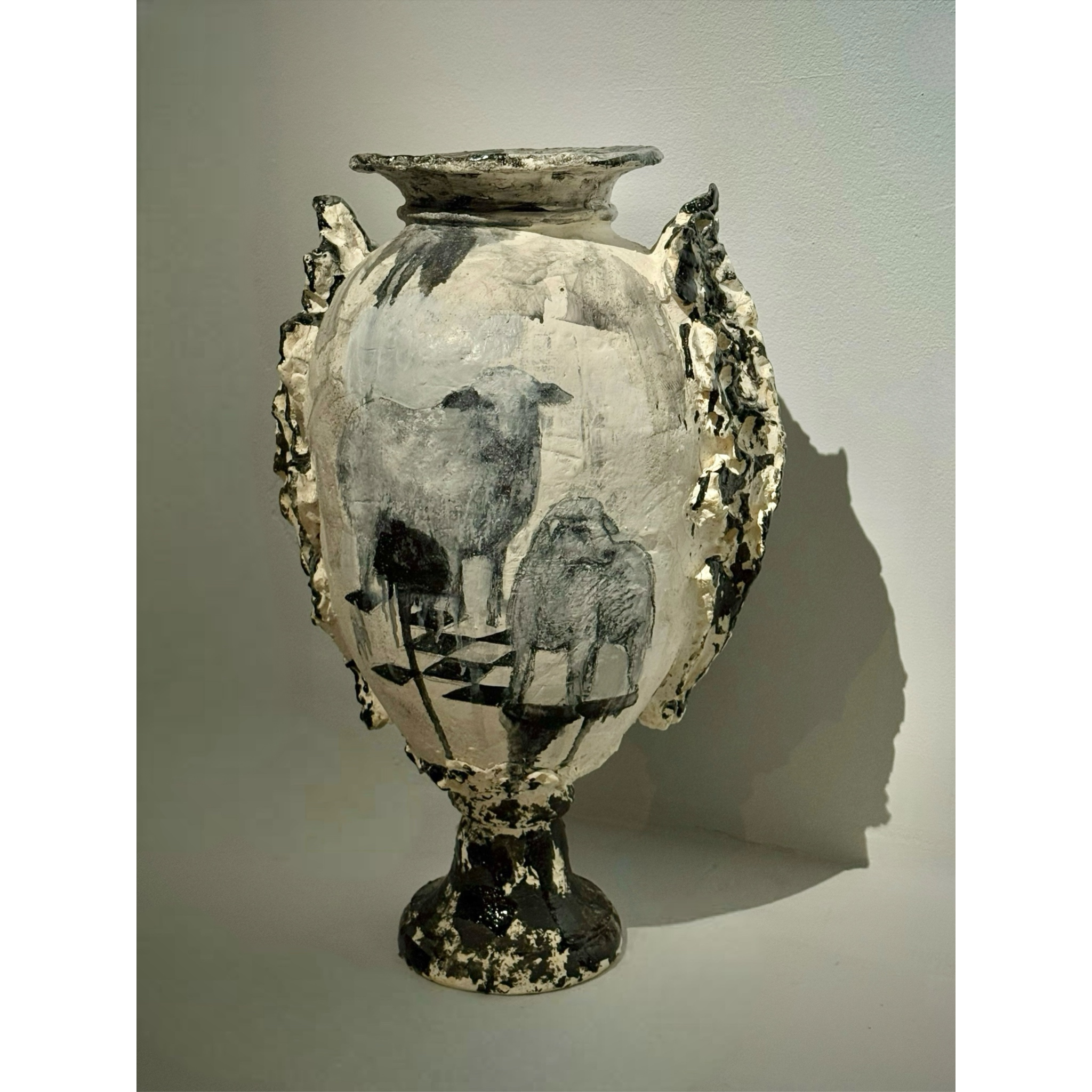 Работа из проекта Marinus. Узнаваемый образ в творчестве Анны Канфер – мотивы парадных залов и бесконечных извилистых коридоров, отсылающие к атмосфере дореволюционных особняков. В проекте Marinus этот образ трансформируется: стены коридоров распахиваются, открывая взгляду простор и море. Руины перестают быть символом разрушения – они превращаются в своеобразные окна, через которые можно увидеть бескрайний морской горизонт. Герои картин – объекты памяти и проводники вне времени; художница также отобразила их в керамике, сделав более осязаемыми для зрителя.