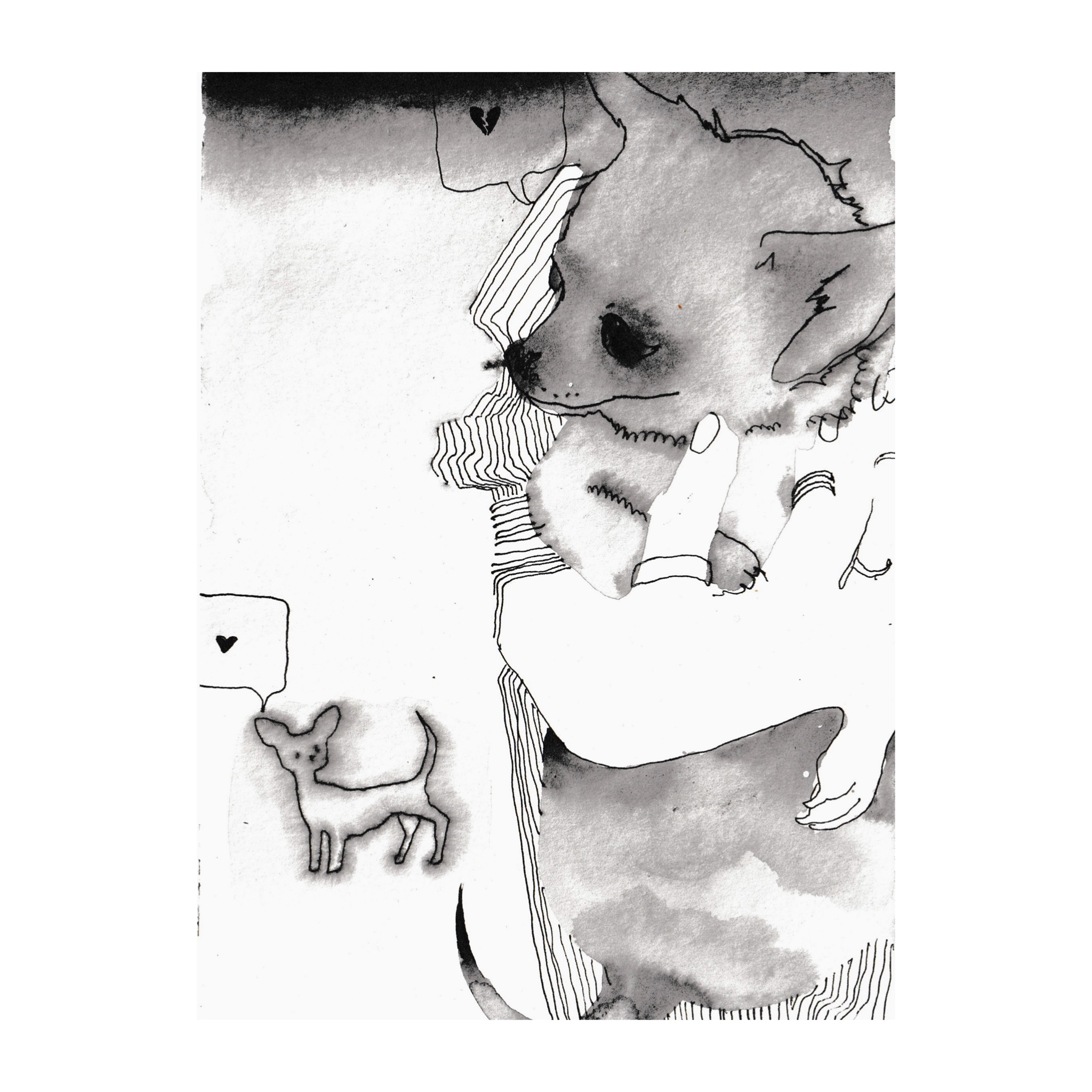 Графические листы с изображением собак — это своего рода фантазия на тему собачьей жизни. У художницы никогда не было собаки, но ей всегда нравилось наблюдать за этими удивительными существами: за тем, как они познают мир, встречаются и знакомятся, гуляют и играют. Её восхищает то, насколько разными могут быть их характеры и привычки. Всё это искренне умиляет Диану, поэтому она нередко включает собак в свои работы. А ещё ей захотелось создать для них отдельную серию — лёгкую, тёплую, немного забавную, чтобы привнести в творчество нотку разрядки и нежного веселья.