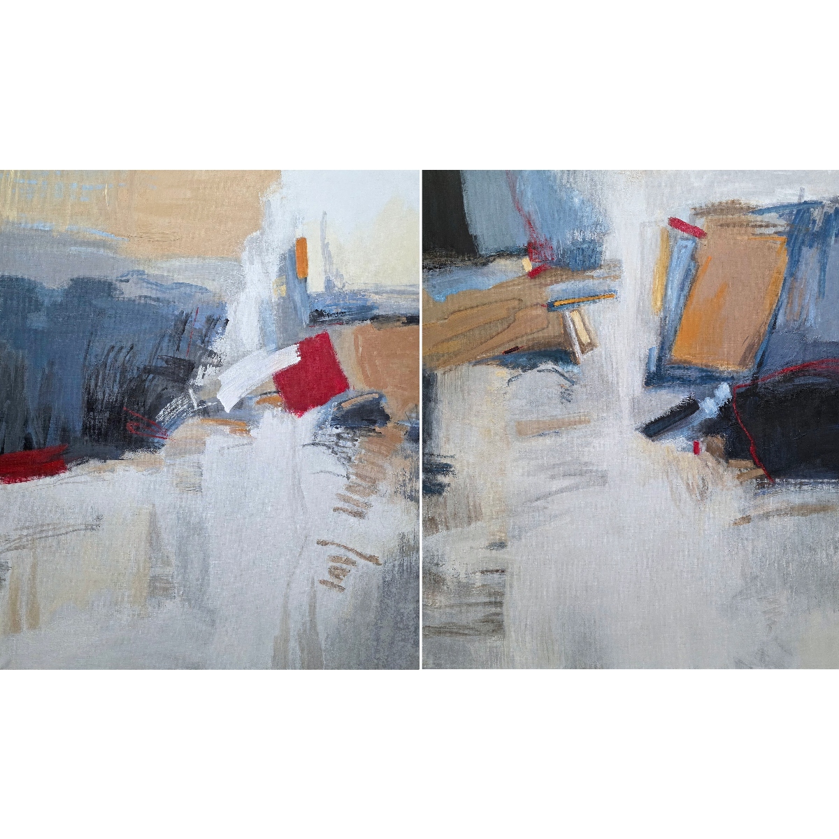 Художница намерено использует 2 холста, выводит зрителя за рамки отдельного полотна и предлагает воспринимать их как единое целое. Образовавшийся новый центр композиции - метафора внутреннего диалога личности. При этом изображение специально не продолжается с одного холста на другой, и этим автор усиливает напряжение взаимодействия. В этой работе глубина синего – это наше внутреннее “я”. Белый - пространство возможностей. В контрасте плотного насыщенного синего и легкого воздушного белого рождается напряжение. Красный мазок- пробуждение воли, который заставляет нас меняться и двигаться вперед. Она хочет, чтобы эти работы стали зеркалом, в котором каждый мог бы увидеть собственный внутренний ландшафт, натолкнуть на размышления. Холст, акрил, масляная пастель