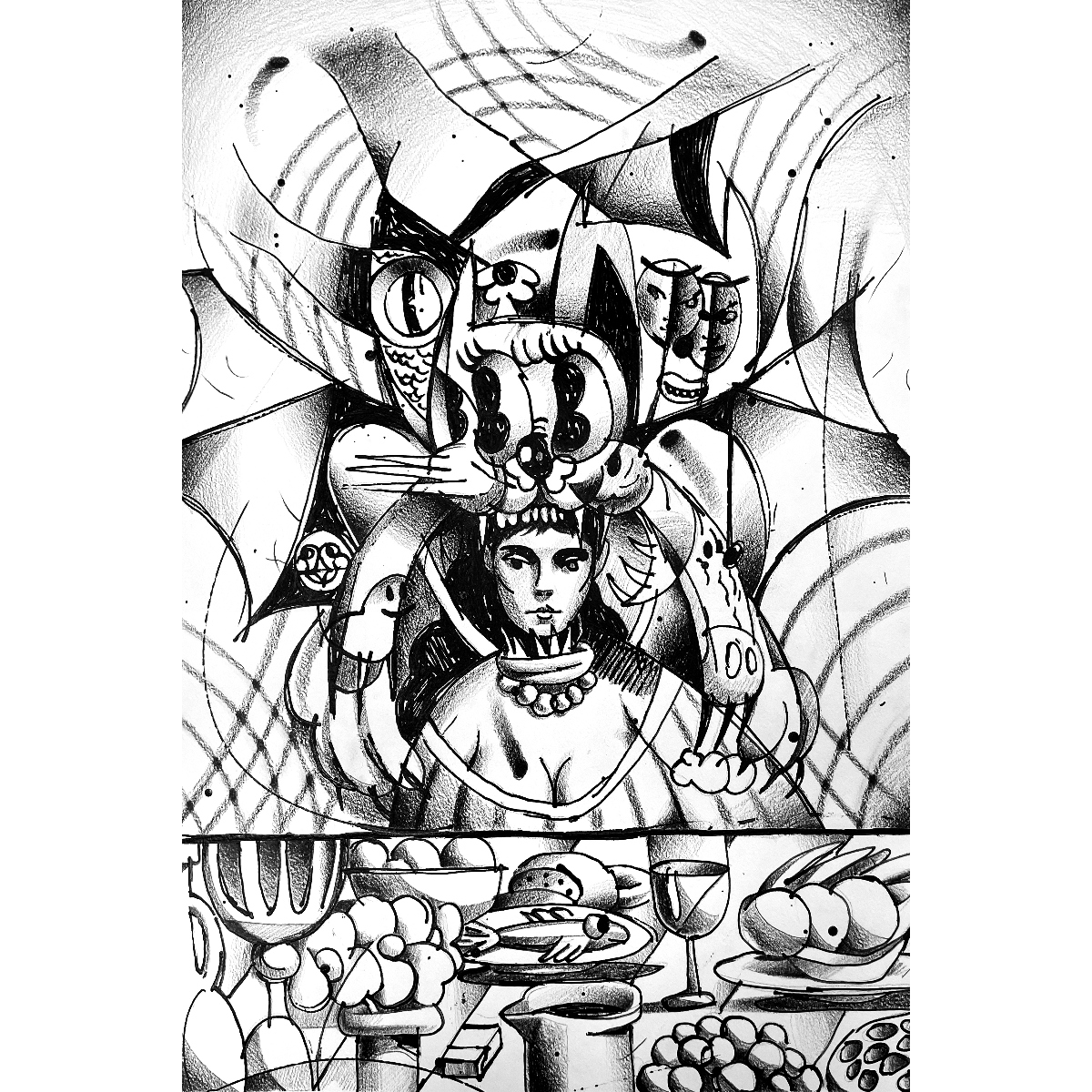 Бумага, акрил, карандаш Как часто перед сном вас захватывает поток навязчивых мыслей — сменяющих друг друга, словно кадры в бесконечной проекции? Воображение начинает работать автономно, создавая странные, порой абсурдные сценарии, лишь отчасти связанные с реальностью. В условиях нарастающего информационного шума, стремительного развития технологий и алгоритмов формируется особое состояние — фоновая тревожность, ставшая неотъемлемой частью современного опыта. Это тихое, но масштабное явление влияет на то, как мы думаем, чувствуем и воспринимаем будущее. Не случайно психотерапия превратилась в один из символов нашего времени. Под воздействием внешних факторов воображение способно конструировать настолько яркие и убедительные образы возможного будущего, что реальность постепенно отступает на второй план. Этот механизм лежит в основе серии “Weird Thoughts”. Её персонажи словно растворяются в собственных фантазиях: их силуэты размыты, в то время как воображаемые миры обретают плотность, насыщенность и визуальную выразительность. Художественный язык серии строится на контрасте — между блеклой, ускользающей реальностью и гипертрофированным, эклектичным пространством внутренних образов. Здесь страхи обретают форму: кто-то, охваченный тревогой перед катастрофами, населяет свои мысли чудовищами, сжигающими города; кто-то, одержимый идеей вечной молодости, мчится в фантазийном кабриолете-пилюле сквозь ландшафты собственного сознания. В этих сюжетах легко узнать себя. И, возможно, благодаря намеренно насыщенной, местами наивной живописной манере, зритель получает шанс отстраниться, взглянуть на свои тревоги со стороны — и затем вернуться к реальности, к её подлинной, живой и многослойной палитре.