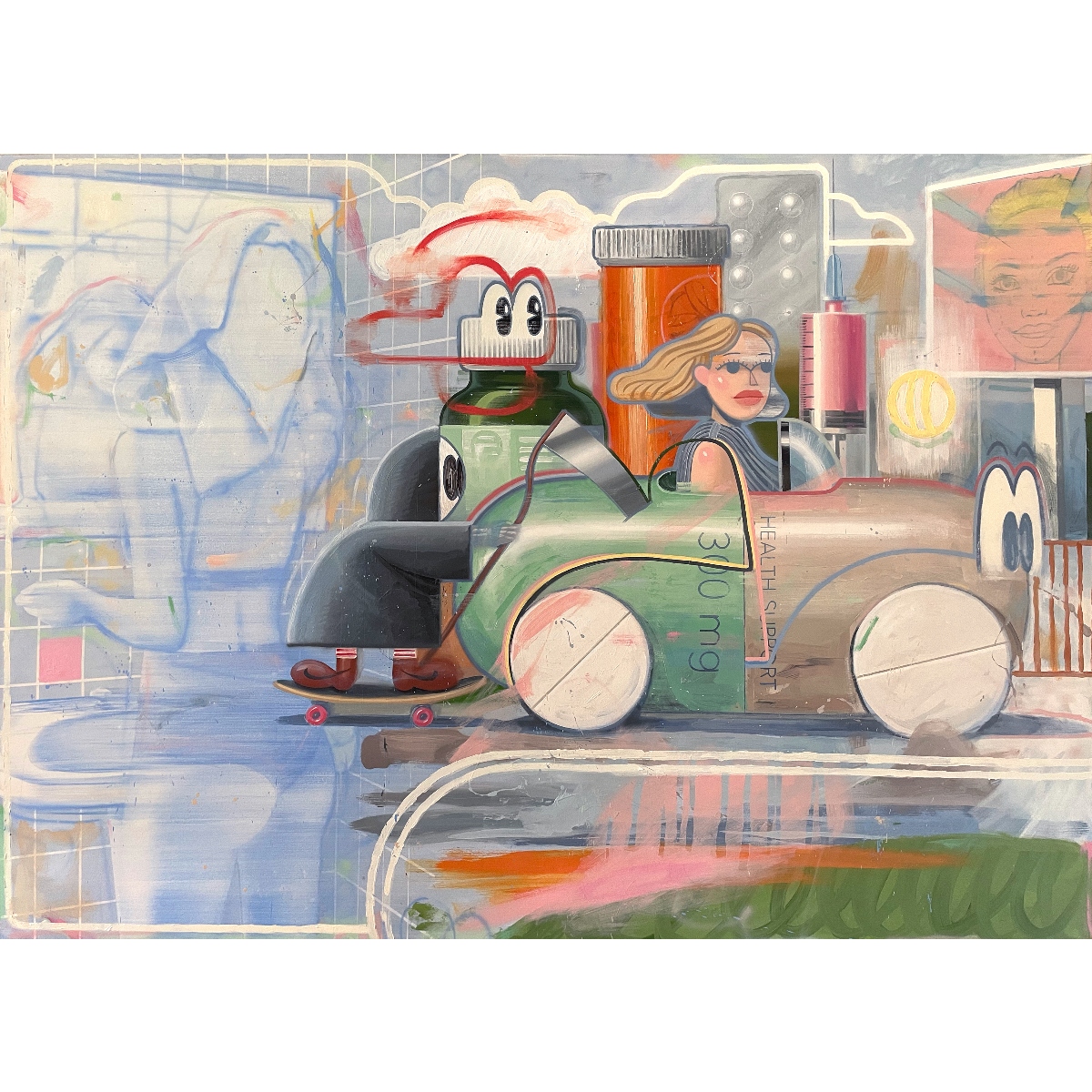 Как часто перед сном вас захватывает поток навязчивых мыслей — сменяющих друг друга, словно кадры в бесконечной проекции? Воображение начинает работать автономно, создавая странные, порой абсурдные сценарии, лишь отчасти связанные с реальностью. В условиях нарастающего информационного шума, стремительного развития технологий и алгоритмов формируется особое состояние — фоновая тревожность, ставшая неотъемлемой частью современного опыта. Это тихое, но масштабное явление влияет на то, как мы думаем, чувствуем и воспринимаем будущее. Не случайно психотерапия превратилась в один из символов нашего времени. Под воздействием внешних факторов воображение способно конструировать настолько яркие и убедительные образы возможного будущего, что реальность постепенно отступает на второй план. Этот механизм лежит в основе серии “Weird Thoughts”. Её персонажи словно растворяются в собственных фантазиях: их силуэты размыты, в то время как воображаемые миры обретают плотность, насыщенность и визуальную выразительность. Художественный язык серии строится на контрасте — между блеклой, ускользающей реальностью и гипертрофированным, эклектичным пространством внутренних образов. Здесь страхи обретают форму: кто-то, охваченный тревогой перед катастрофами, населяет свои мысли чудовищами, сжигающими города; кто-то, одержимый идеей вечной молодости, мчится в фантазийном кабриолете-пилюле сквозь ландшафты собственного сознания. В этих сюжетах легко узнать себя. И, возможно, благодаря намеренно насыщенной, местами наивной живописной манере, зритель получает шанс отстраниться, взглянуть на свои тревоги со стороны — и затем вернуться к реальности, к её подлинной, живой и многослойной палитре.
