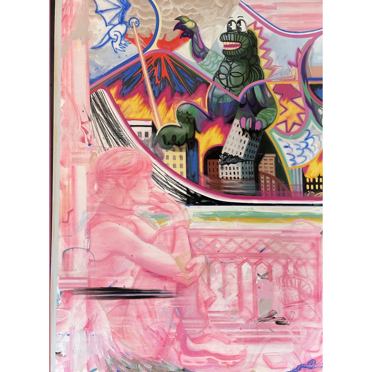 Как часто перед сном вас захватывает поток навязчивых мыслей — сменяющих друг друга, словно кадры в бесконечной проекции? Воображение начинает работать автономно, создавая странные, порой абсурдные сценарии, лишь отчасти связанные с реальностью. В условиях нарастающего информационного шума, стремительного развития технологий и алгоритмов формируется особое состояние — фоновая тревожность, ставшая неотъемлемой частью современного опыта. Это тихое, но масштабное явление влияет на то, как мы думаем, чувствуем и воспринимаем будущее. Не случайно психотерапия превратилась в один из символов нашего времени. Под воздействием внешних факторов воображение способно конструировать настолько яркие и убедительные образы возможного будущего, что реальность постепенно отступает на второй план. Этот механизм лежит в основе серии “Weird Thoughts”. Её персонажи словно растворяются в собственных фантазиях: их силуэты размыты, в то время как воображаемые миры обретают плотность, насыщенность и визуальную выразительность. Художественный язык серии строится на контрасте — между блеклой, ускользающей реальностью и гипертрофированным, эклектичным пространством внутренних образов. Здесь страхи обретают форму: кто-то, охваченный тревогой перед катастрофами, населяет свои мысли чудовищами, сжигающими города; кто-то, одержимый идеей вечной молодости, мчится в фантазийном кабриолете-пилюле сквозь ландшафты собственного сознания. В этих сюжетах легко узнать себя. И, возможно, благодаря намеренно насыщенной, местами наивной живописной манере, зритель получает шанс отстраниться, взглянуть на свои тревоги со стороны — и затем вернуться к реальности, к её подлинной, живой и многослойной палитре.