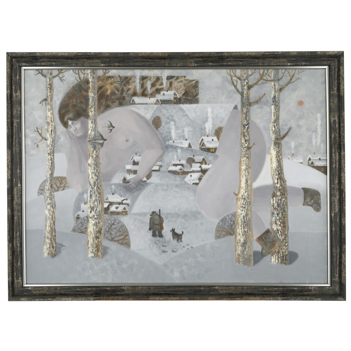 Диптих «Зимушка» — картина-настроение на тему нашей уральской зимы. Эта часть диптиха передаёт состояние раннего морозного утра: хруст снега под валенками и мороз, щиплющий лицо. Охотник, уже проверивший силки, слегка продрог и возвращается домой, где его ждут горячий чай и душевные разговоры у печки.