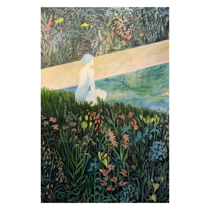 Работа входит в цикл моих размышлений о безопасном месте, необходимом пространстве, где можно пребывать: в оазисе воспоминаний или мечт. В этом цикле образ ныряльщицы символизирует стремительную силу, вхождение в неизвестность. В композиции фигура находится в спокойствии, а не в прыжке - это позиция наблюдателя.