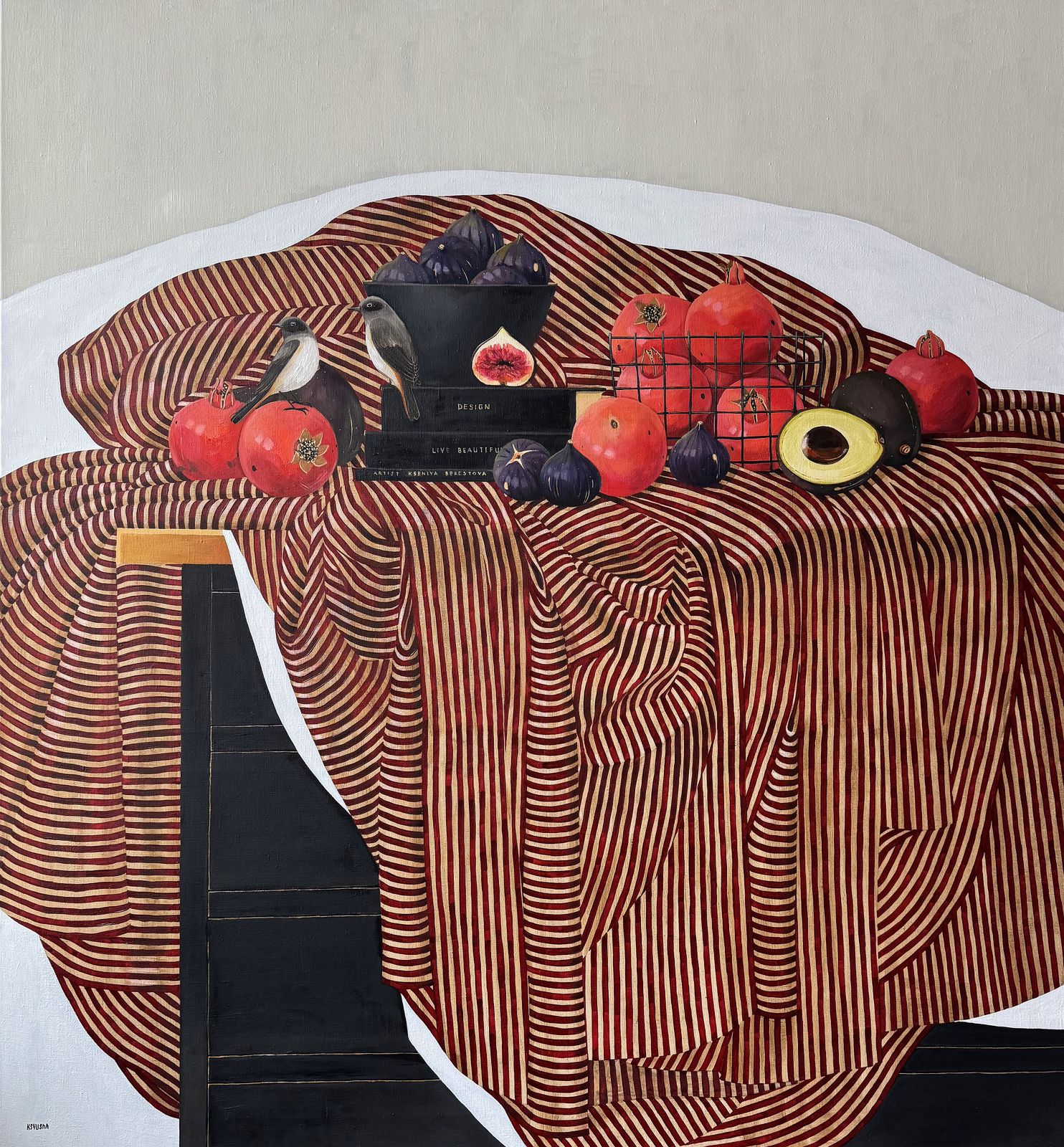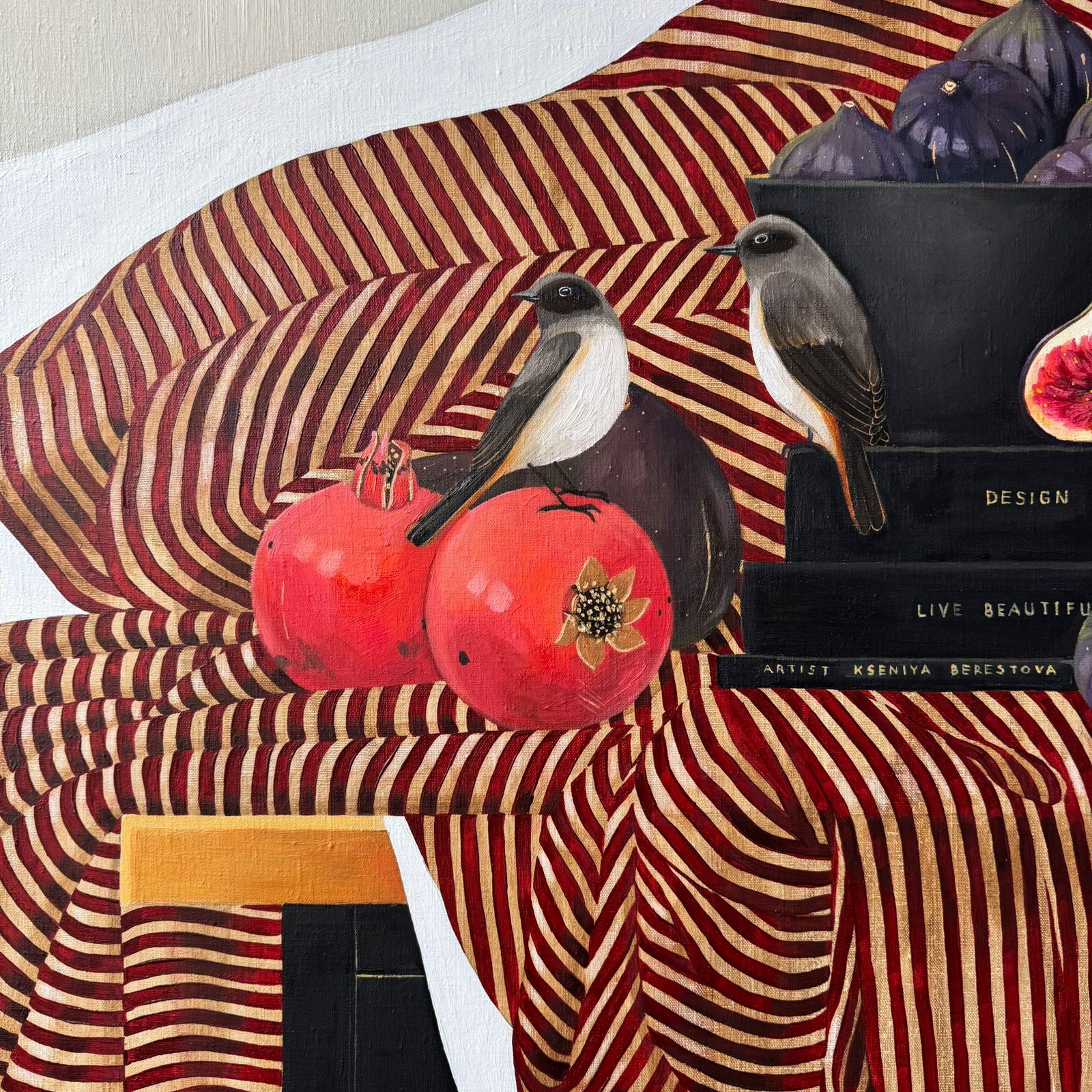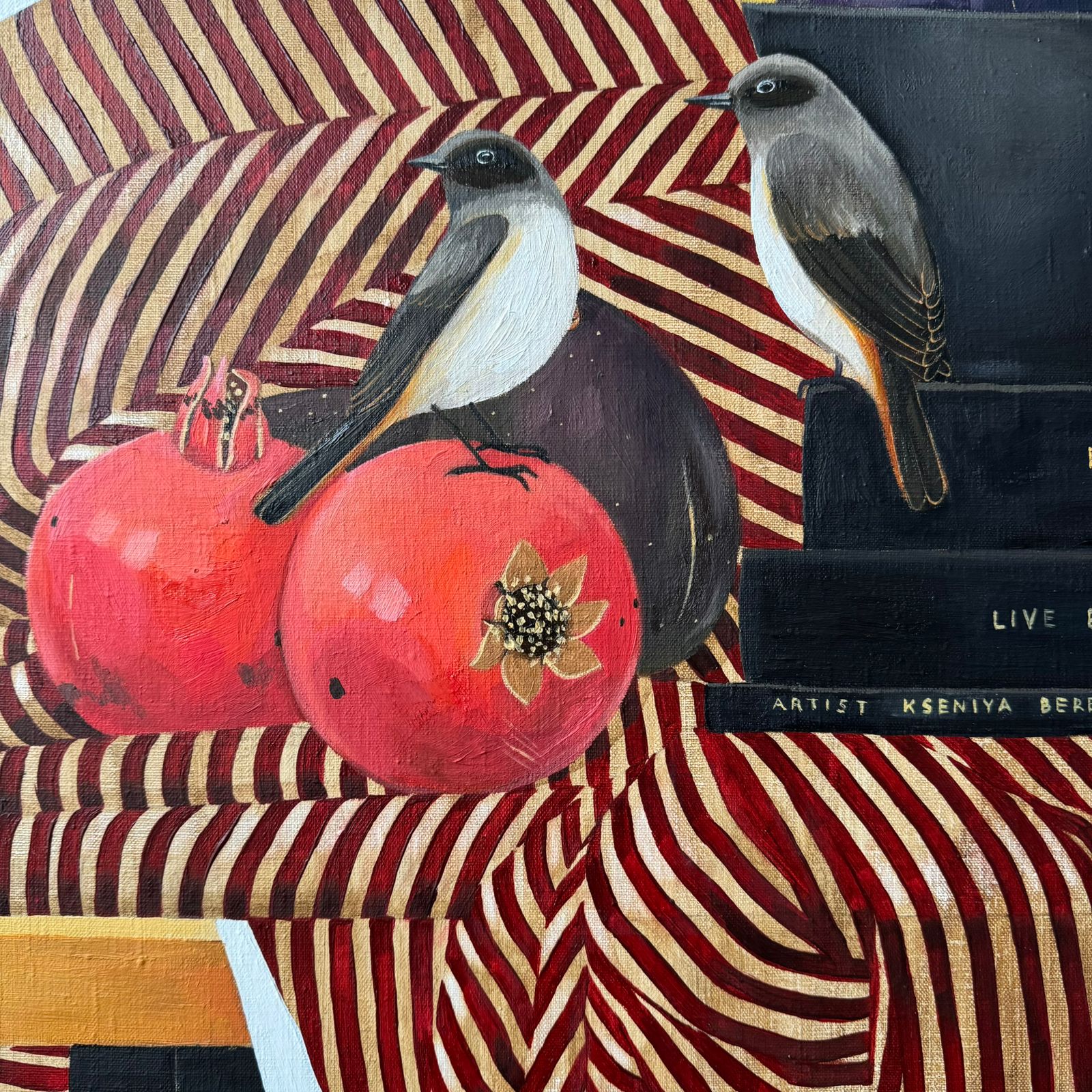 Жизнь прекрасна! Да, она хороша! Две птички словно хозяева этого дома, где вокруг царит комфорт, богатство и изобилие. Их окружают книги, гранаты, инжир и авокадо - такой пир и великолепие.