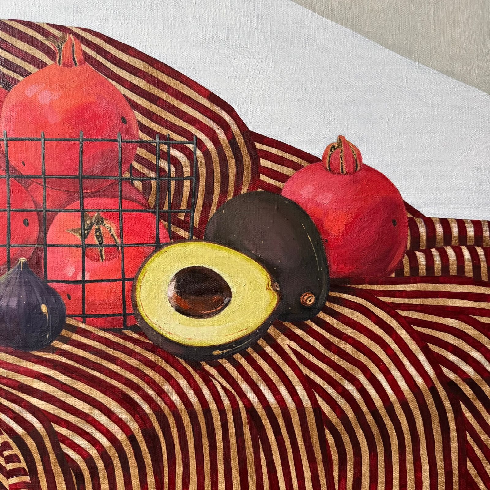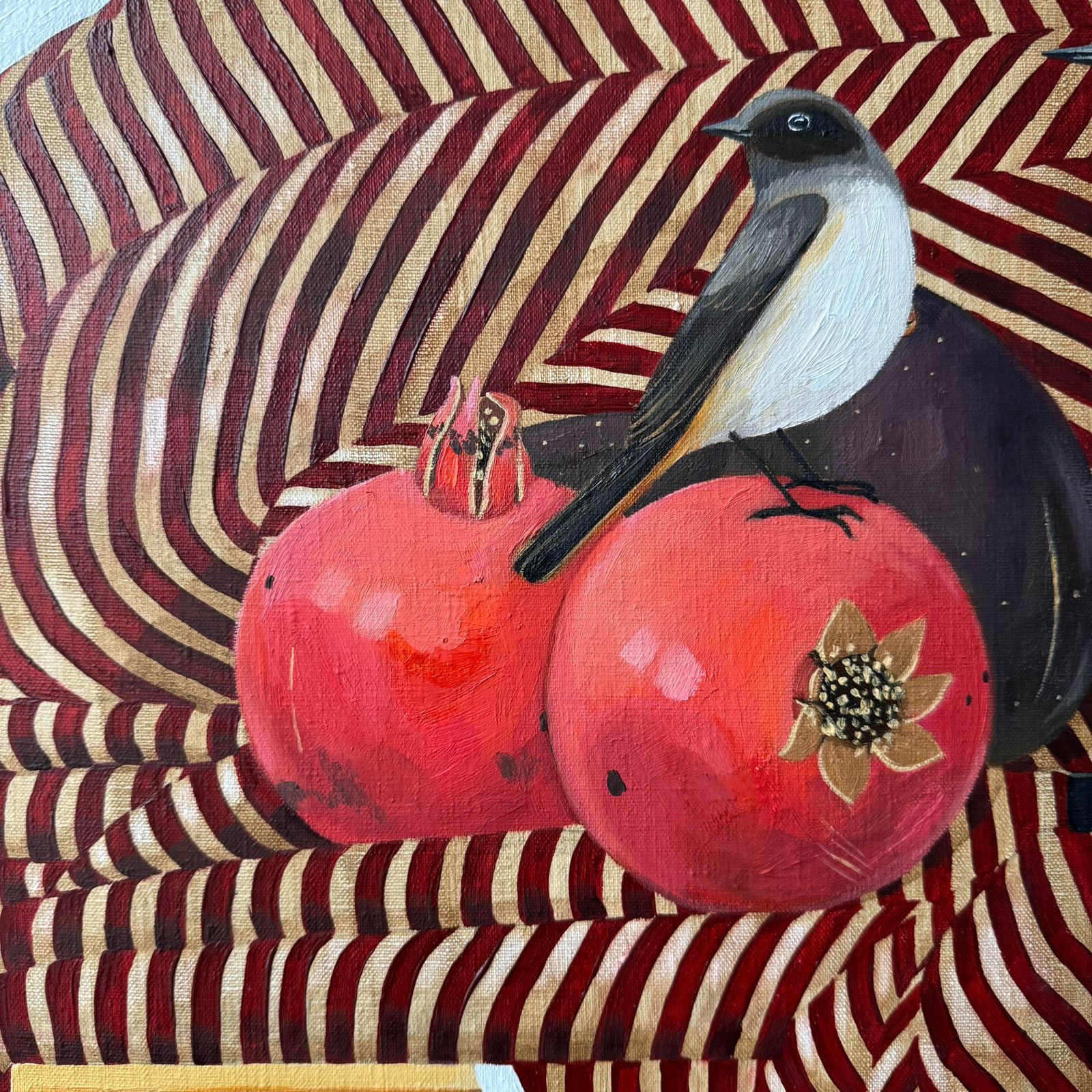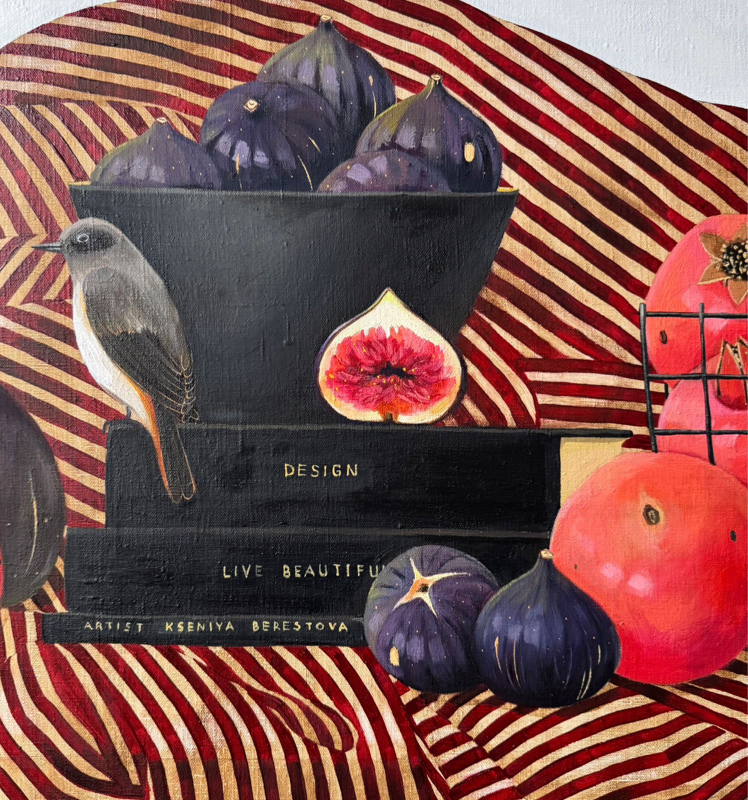 Жизнь прекрасна! Да, она хороша! Две птички словно хозяева этого дома, где вокруг царит комфорт, богатство и изобилие. Их окружают книги, гранаты, инжир и авокадо - такой пир и великолепие.