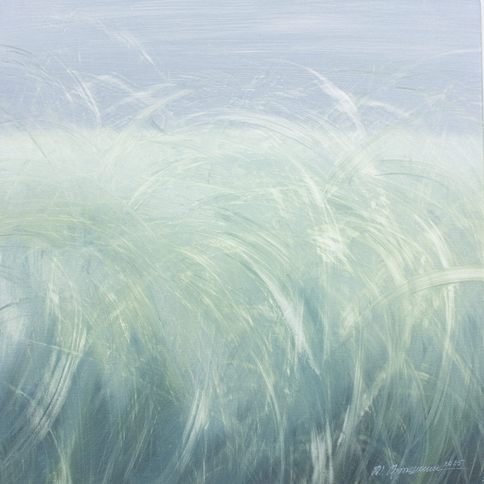 Работа из серии "травы. В этой серии через образ трав художница создает знакомые, комфортные и безопасные пространства, чтобы, запутавшись в их линиях, отключиться от внешнего шума и найти свои 'внутренние травы'. Образ пришел после поездки на Куршскую косу, где именно травы оказались единственным, что смогло остановить тонны безжизненных, всеуничтожающих песков. Поэтому для Татьяны они стали символом внутренней опоры – сил, способных сдержать внутренний дестрой и создать основу для жизни. Травы не сопротивляются естественным внешним воздействиям – ветру и дождю – а, напротив, гармонично с ними сосуществуют, олицетворяя экологичную, симбиотическую связь с внешним миром. Также, как в природе каждая травинка уникальна, так и в работах художницы они – оставленные на красочном слое 'отрицательные' и 'положительные' следы, которые невозможно воспроизвести в точности еще раз. При этом совмещение реалистического и абстрактного изображений в одно целое создают новые формы, созвучные нашему времени, в котором схлестывается так много: реальное и виртуальное, естественное и искусственное, личное и общественное.
