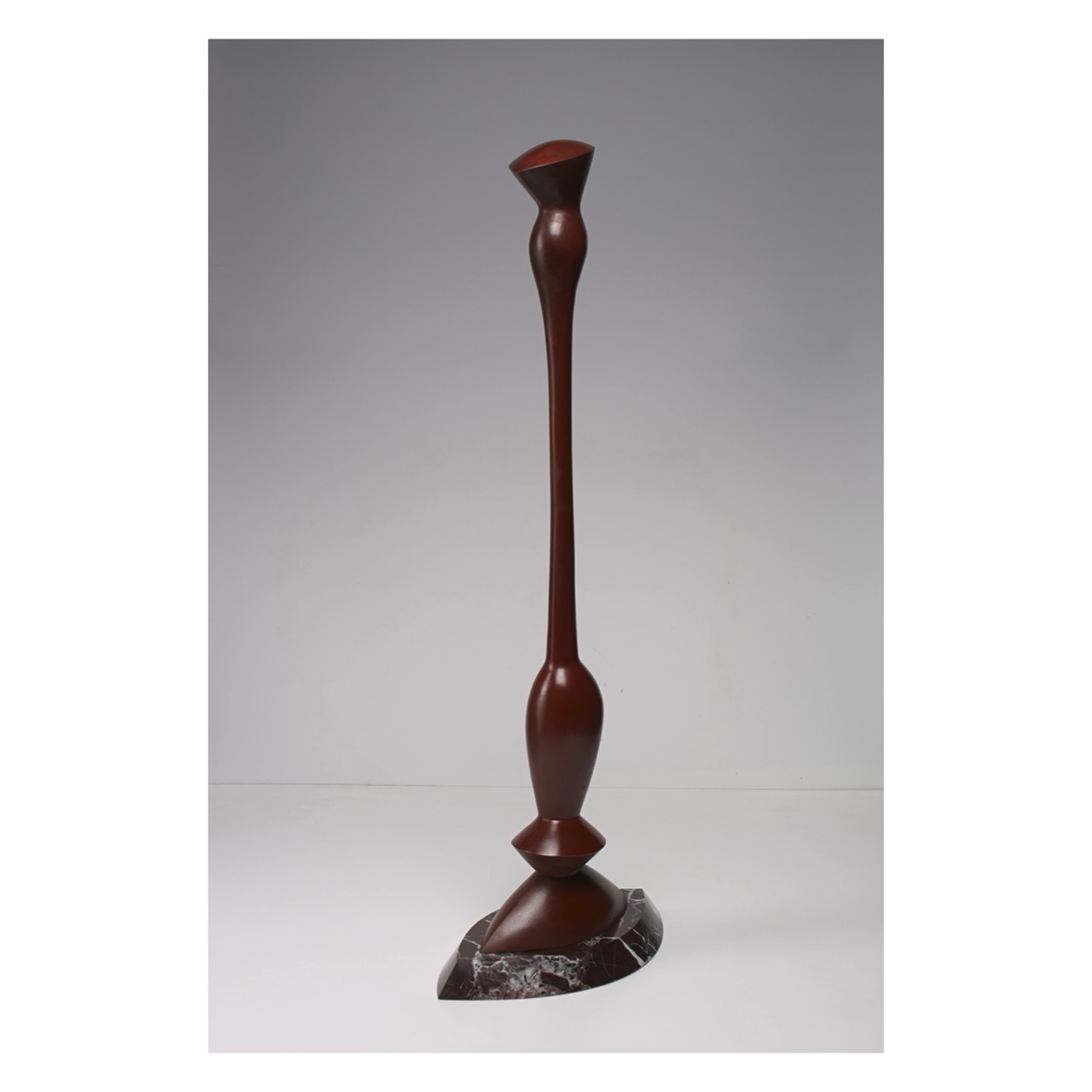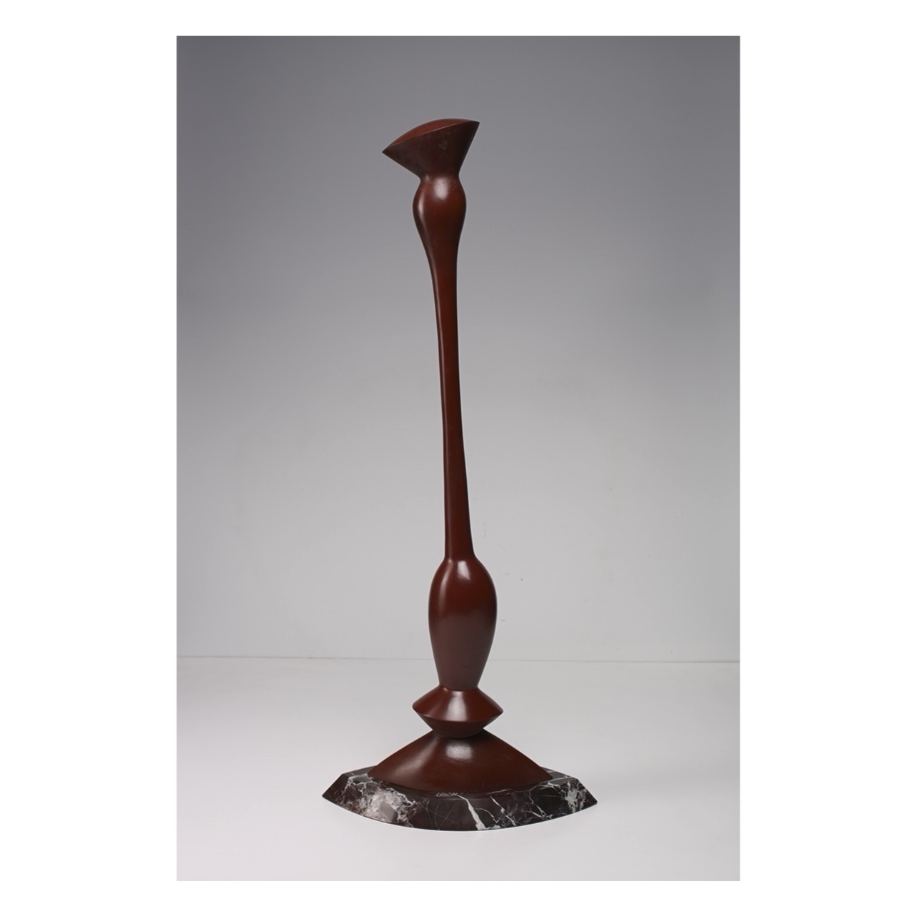 Возможен авторский повтор. Абстрагированный органический мир, лежащий в основе создания формы, продолжает оставаться узнаваемым. Условность и насыщенная сдержанность раскрывают образ. Красный цвет покрывает растение для усиления его значения - стойкости и долговечности. Подставка из красного мрамора была выбрана для структурной целостности на уровне формы и цвета. Материалы: бронза, патина. Камень: мрамор.