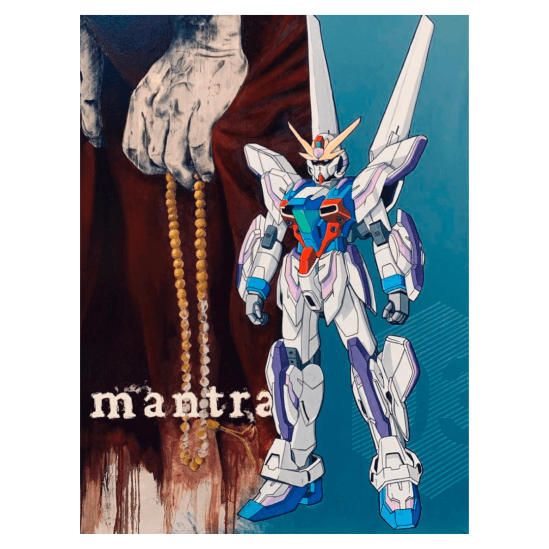 Картина Ильи Бодрова «Mantra» воплощает дуальность и равновесие многоликой восточной культуры. Часть работы отображает символы традиционных религий, в частности, буддизма. В противоположной части художник разместил изображение знаменитого японского робота-трансформера Gundam. Автор интерпретирует робота как символ культа мультипликационных персонажей, равного религиозным по масштабу.