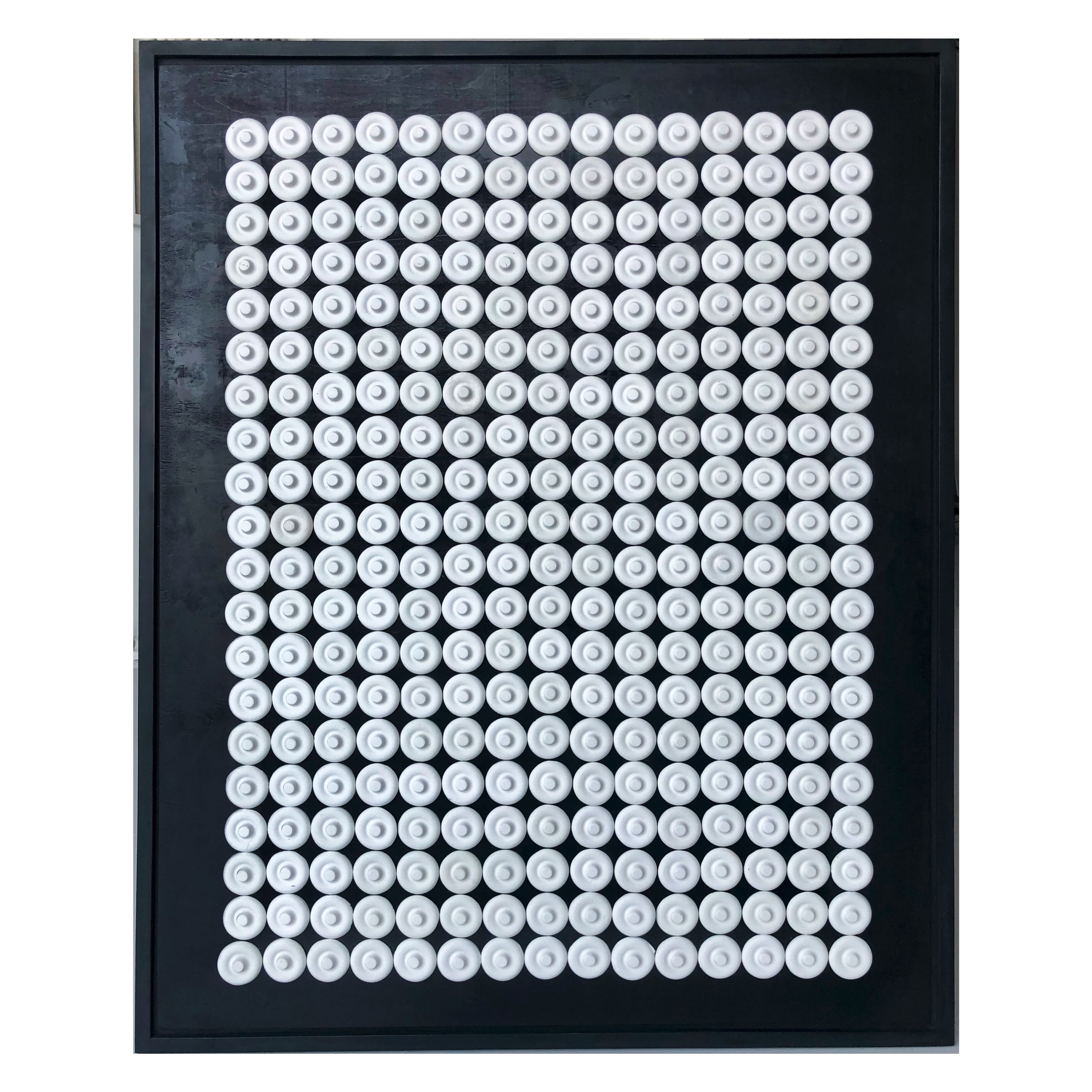 Упорядочить – значит понять и успокоиться. Процесс выравнивания – как способ медитации, принятия себя. Панно в раме. Материал: бетон, чёрный матовый лак, основа – дерево.