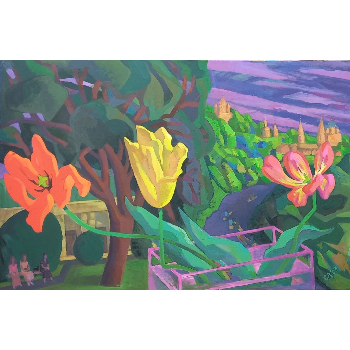 Картина была написана после путешествия Светланы с супругом, Азамом Атахановым, в Суздаль — сразу после снятия ковидных ограничений. Поездка стала для художников настоящим глотком воздуха и свободы. Светлана и Азам посетили самые красивые места Владимирской области и, преодолев немало трудностей, наконец смогли остановиться в гостинице в Суздале. Погода стояла замечательная, прогулки были особенно приятными и вдохновляющими. Художники наслаждались красотой города и его природы — Суздаль по праву можно назвать музеем под открытым небом. Речка Каменка, приток Нерли, живописно огибает город. Ее берега с церквями, монастырями и природным ландшафтом поражают своей гармонией. По реке курсирует речной трамвайчик, а многие любят сплавляться по Каменке на сапах. Недалеко от Спасо-Евфимиева монастыря, за торговыми рядами, открывается прекрасный вид на Каменку и заливные луга. Именно там Светлана и Азам сделали несколько зарисовок: Азам рисовал Светлану на фоне пейзажа, а Светлана работала над пейзажем. Так родилась картина «Месяц май», а Азам позже создал портрет на фоне реки Каменки. Тюльпаны — любимые цветы художницы. В этой работе они стали символом мая, весны и счастья — быть в таком прекрасном месте, чувствовать свободу и наслаждаться красотой окружающего мира.
