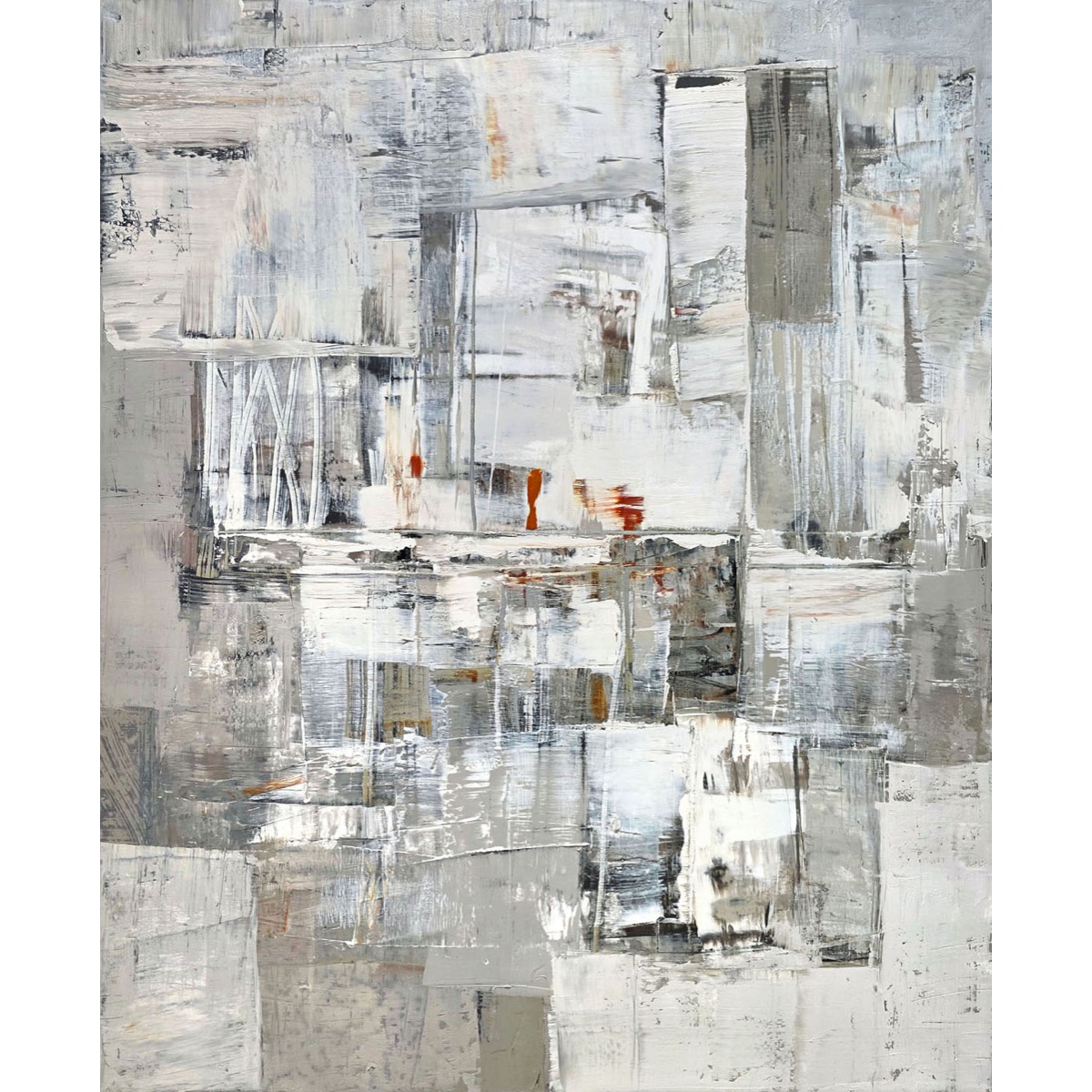 Абстракция, балансирующая между аскетизмом и экспрессией. Основное поле работы решено в сложных нюансах белого, графитового и дымчато-серого тонов. Слои краски накладываются друг на друга, создавая глубину, в которой хочется раствориться. Это ощущение, когда мир вокруг замирает и перестаёт давить. А в центре — оранжевый всплеск. Маленький, почти незаметный, но невероятно живой. Этот элемент нарушает монохромность, не вступая в конфликт с общим настроением, а задавая ему вектор — от холода фона к теплоте момента. Как последний луч солнца перед закатом. Как огонёк свечи в заброшенном доме. Как воспоминание о лете посреди зимы.