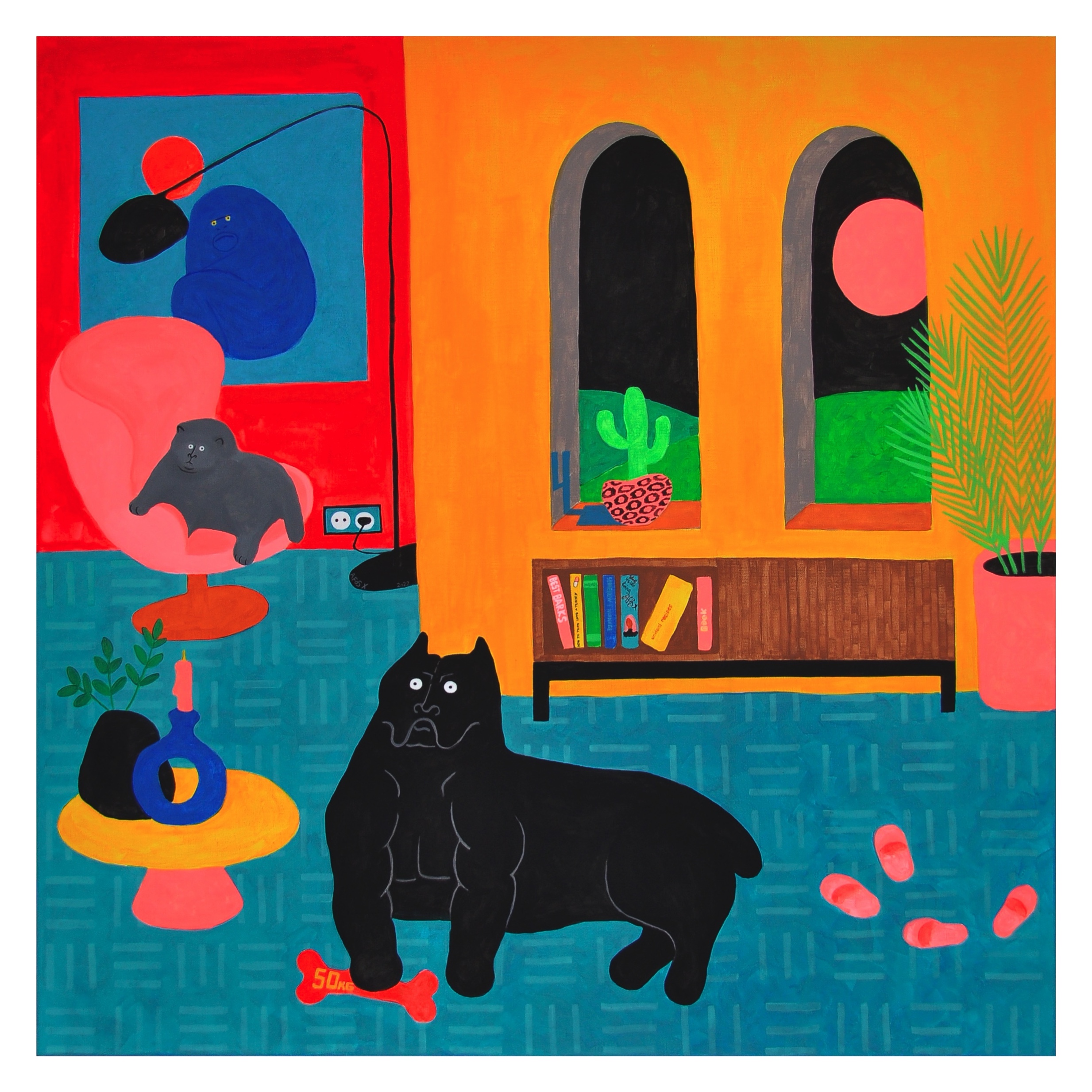На этой картине мы видим двух лучших друзей: крепкого питбуля и очень мягкого и пушистого британца. Они решили закатить вечеринку, и тут запечатлен момент этой невероятной, неповторимой и незабываемой ночи.