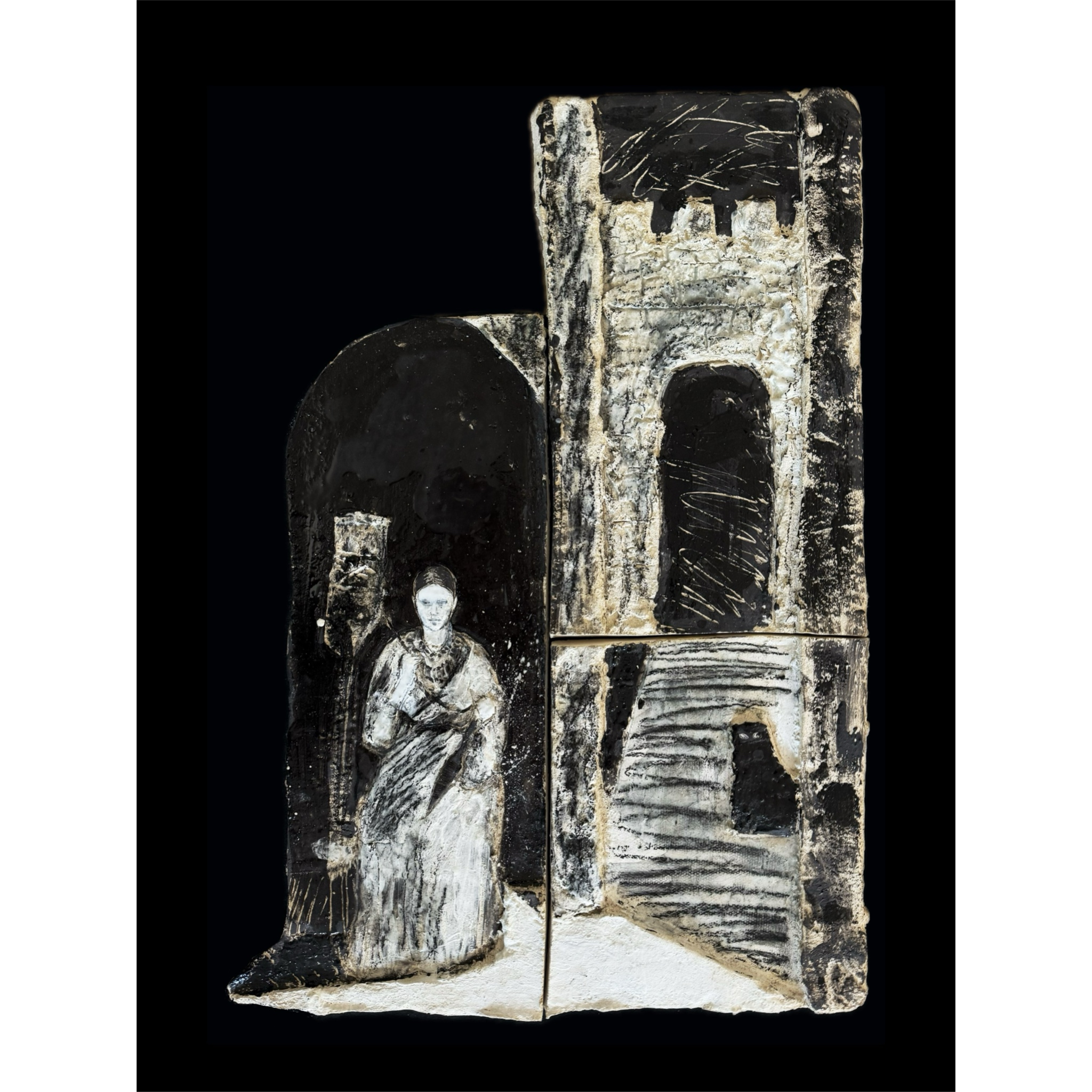 Рельеф из проекта Marinus. Узнаваемый образ в творчестве Анны Канфер – мотивы парадных залов и бесконечных извилистых коридоров, отсылающие к атмосфере дореволюционных особняков. В проекте Marinus этот образ трансформируется: стены коридоров распахиваются, открывая взгляду простор и море. Руины перестают быть символом разрушения – они превращаются в своеобразные окна, через которые можно увидеть бескрайний морской горизонт. Герои картин – объекты памяти и проводники вне времени; художница также отобразила их в керамике, сделав более осязаемыми для зрителя.