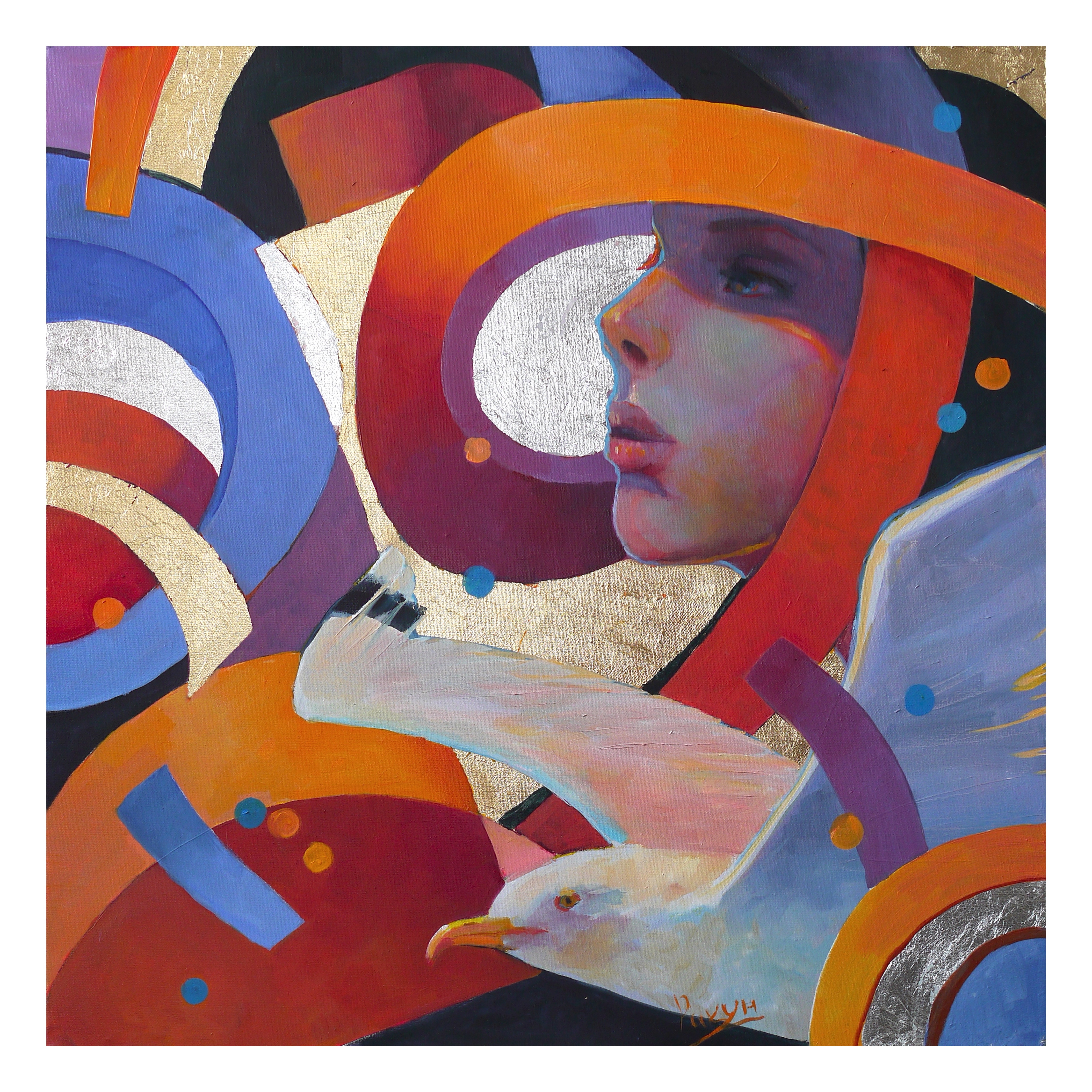 Серия «Чайки» Девушки, яркий цвет, чайки - это гимн молодости, весне и радости жизни. Плеск волн, сияние солнца и соленый ветер. Все это можно ощутить глядя на эту серию картин. Реалистические изображения сочетаются с абстрактными геометрическими фигурами и попадают под их влияние. Доминирующий яркий цвет. Поталь словно разрывает пространство и переносит в другой мир. Мир солнца, бесконечного пространства. Холст, масло, поталь.