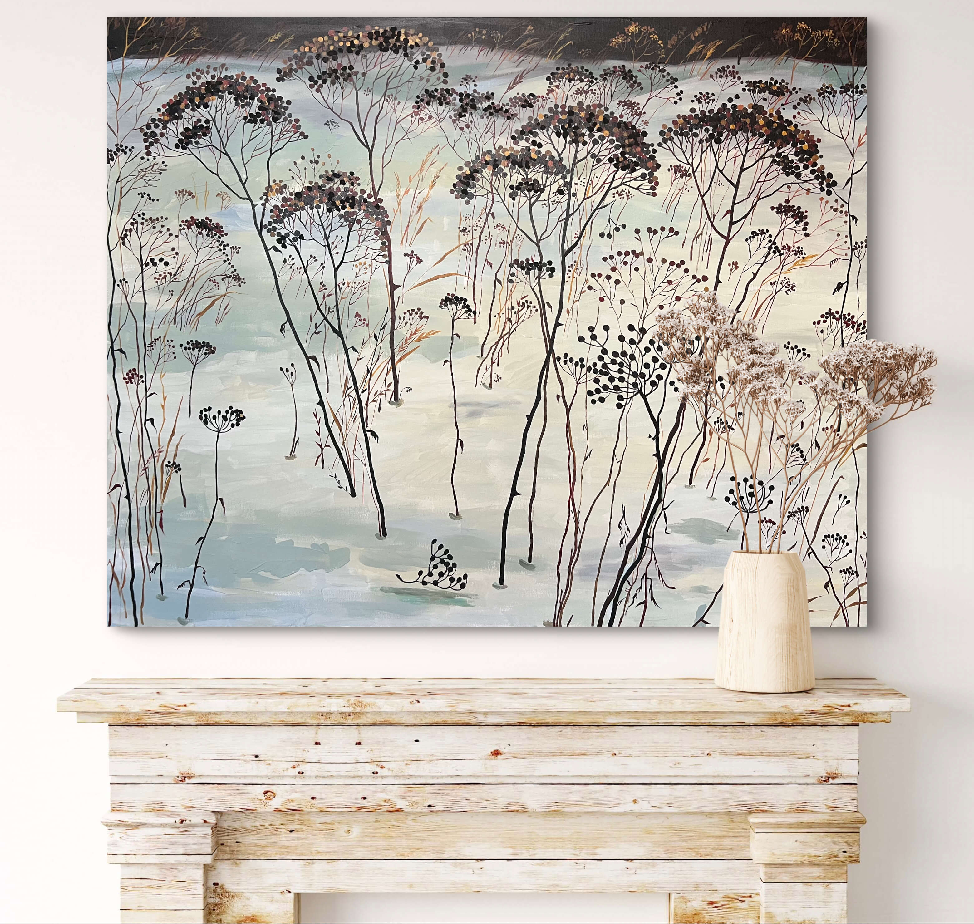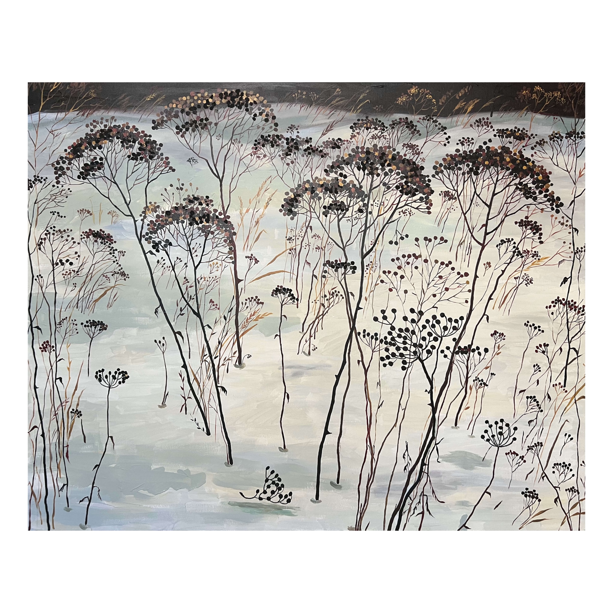 Однажды зимой, прогуливаясь по одному из московских районов, Елена Запрудских заметила пижму — засохшую, укрытую снегом, но по-своему всё ещё красивую. В этом застывшем образе она увидела нечто большее: растение словно затаилось, «отдыхая» и пережидая холода, чтобы с приходом весны вновь обрести жизнь и зелень. Этот момент наполнил художницу философскими размышлениями о стойкости, тишине ожидания и возрождении. Именно это внутреннее ощущение Елена стремилась передать в своей работе.