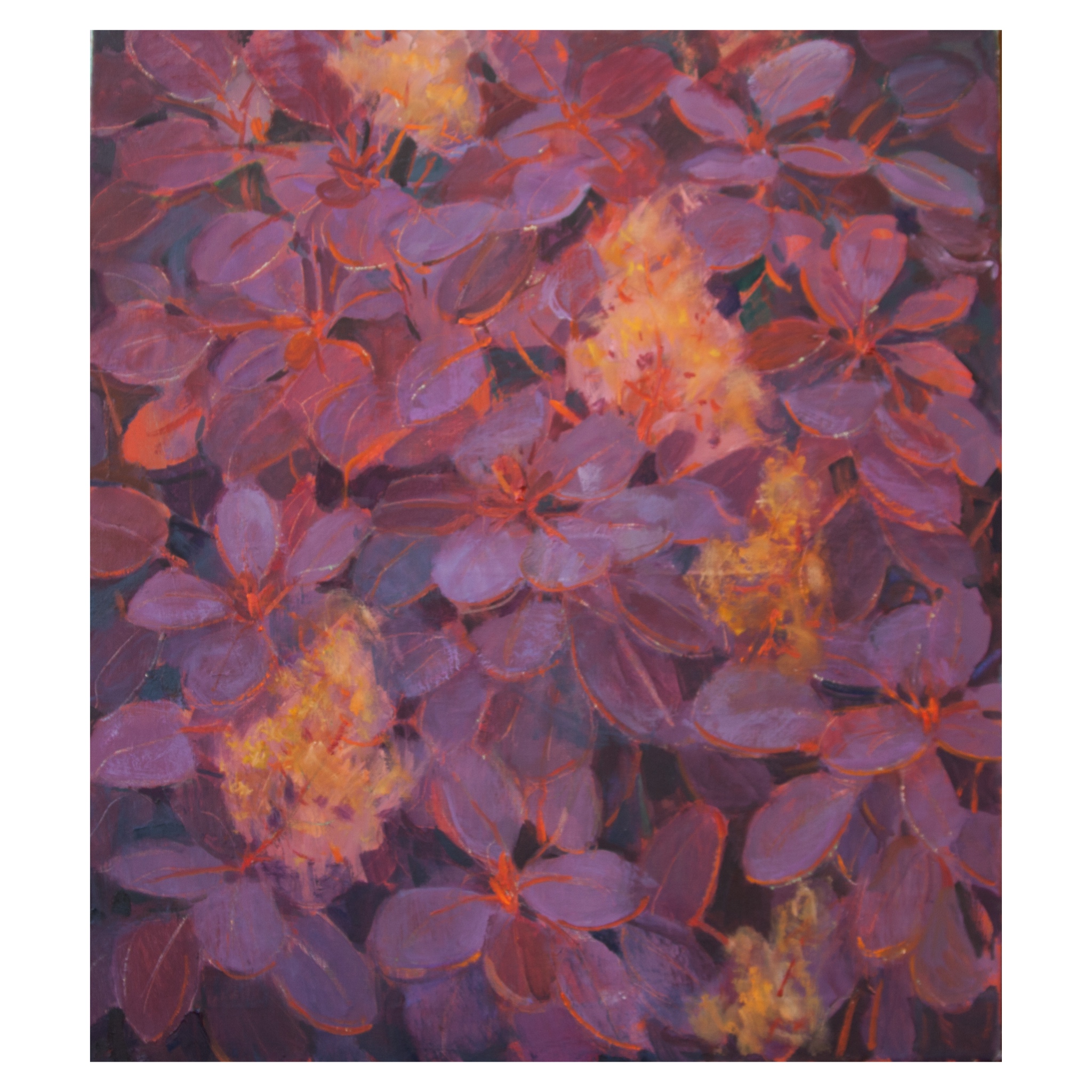 На работу «Скумпия цветет» художницу вдохновил восторг от созерцания цветения этого необыкновенного растения. Яркие лилово-красные листья и нежные лимонно-оранжевые облака соцветий