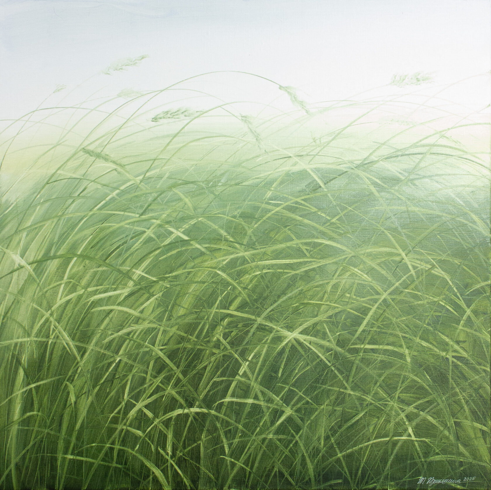 Работа из серии "травы. В этой серии через образ трав художница создает знакомые, комфортные и безопасные пространства, чтобы, запутавшись в их линиях, отключиться от внешнего шума и найти свои 'внутренние травы'. Образ пришел после поездки на Куршскую косу, где именно травы оказались единственным, что смогло остановить тонны безжизненных, всеуничтожающих песков. Поэтому для Татьяны они стали символом внутренней опоры – сил, способных сдержать внутренний дестрой и создать основу для жизни. Травы не сопротивляются естественным внешним воздействиям – ветру и дождю – а, напротив, гармонично с ними сосуществуют, олицетворяя экологичную, симбиотическую связь с внешним миром. Также, как в природе каждая травинка уникальна, так и в работах художницы они – оставленные на красочном слое 'отрицательные' и 'положительные' следы, которые невозможно воспроизвести в точности еще раз. При этом совмещение реалистического и абстрактного изображений в одно целое создают новые формы, созвучные нашему времени, в котором схлестывается так много: реальное и виртуальное, естественное и искусственное, личное и общественное.