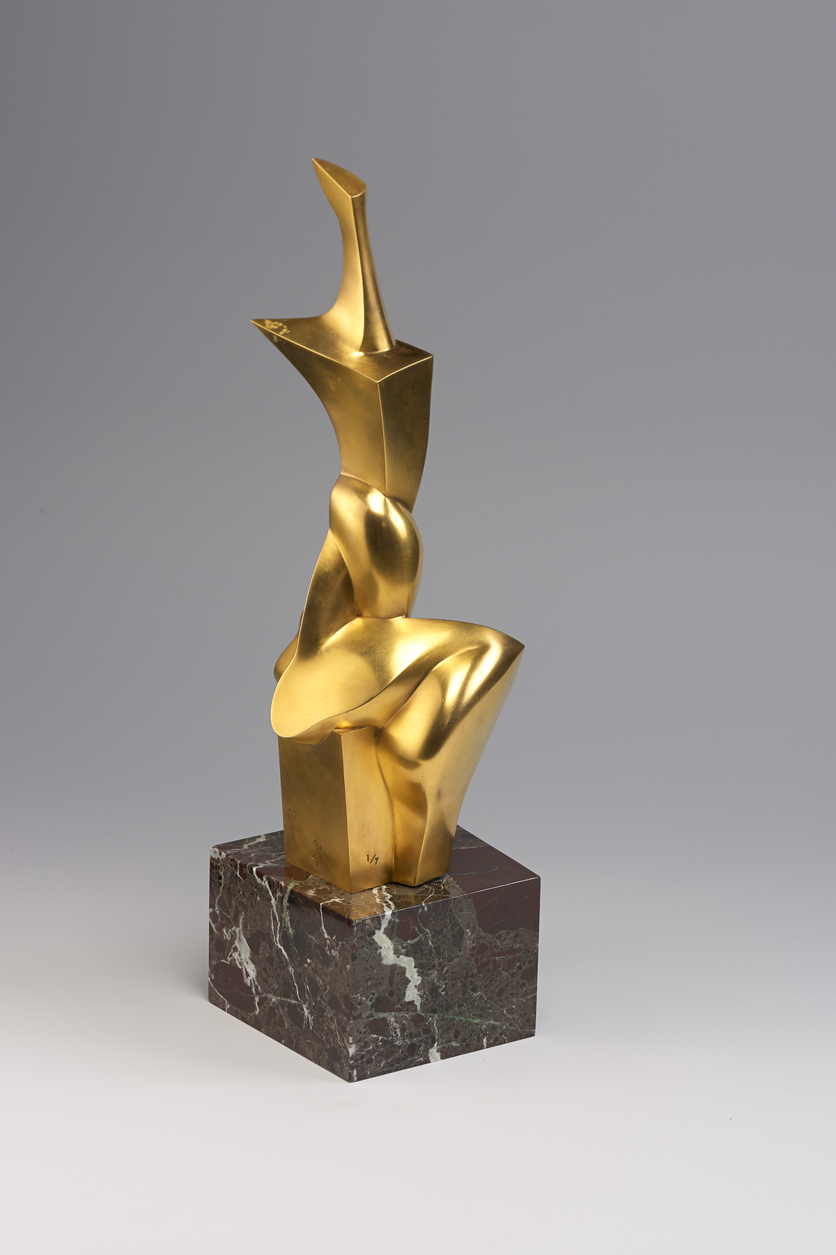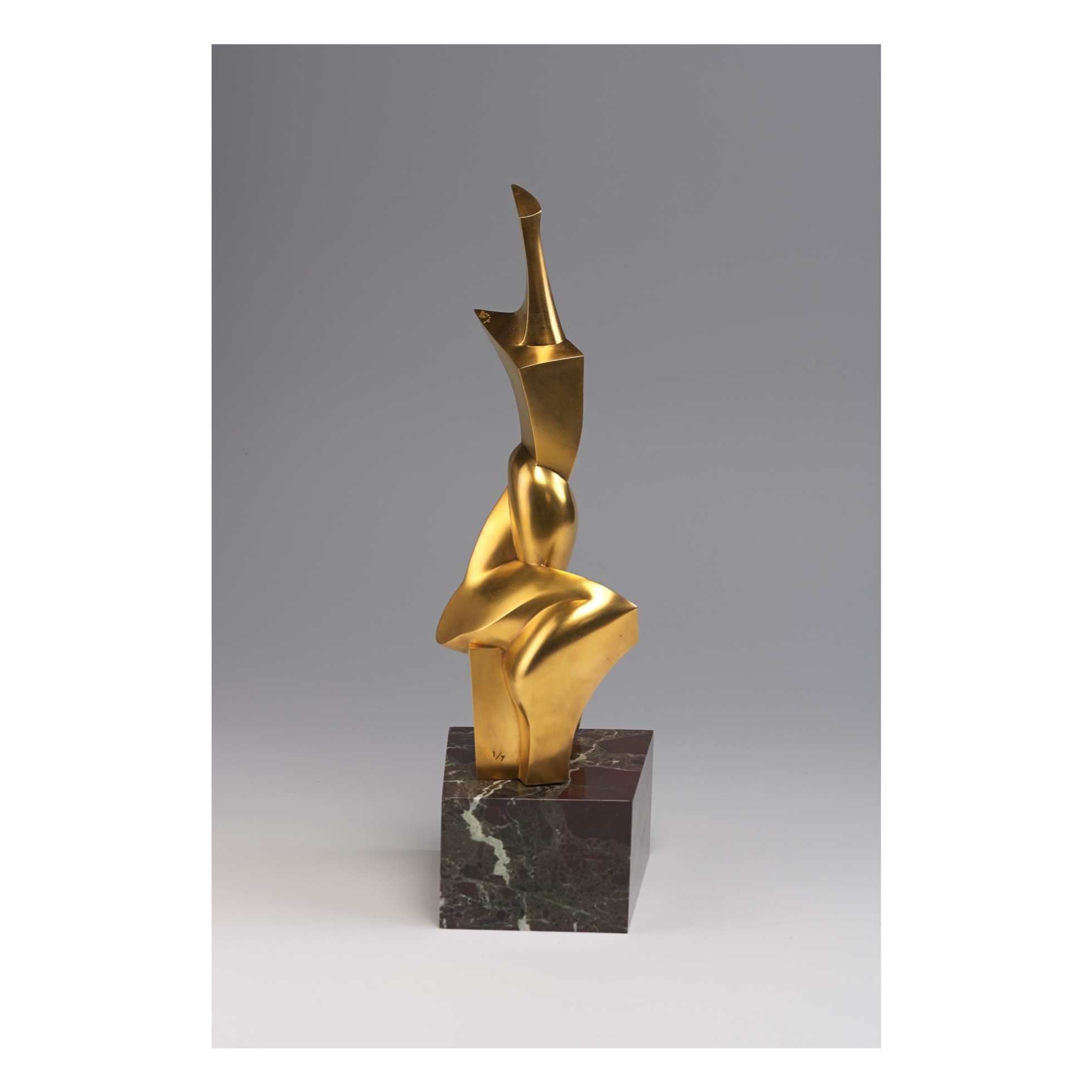 Возможен авторский повтор. 11.5 х 12 х Н 40 см. Бронза, золочение. Мрамор. Limited edition of 7. Четкие формы подчеркивают динамичный силуэт и характер движения. Объемы верхней и нижней частей фигуры движутся в противоположных направлениях, но удерживаются натянутым стержнем в виде спирали. Гармония внутренней завершенности и элегантной чистоты раскрывается в границах формы.
