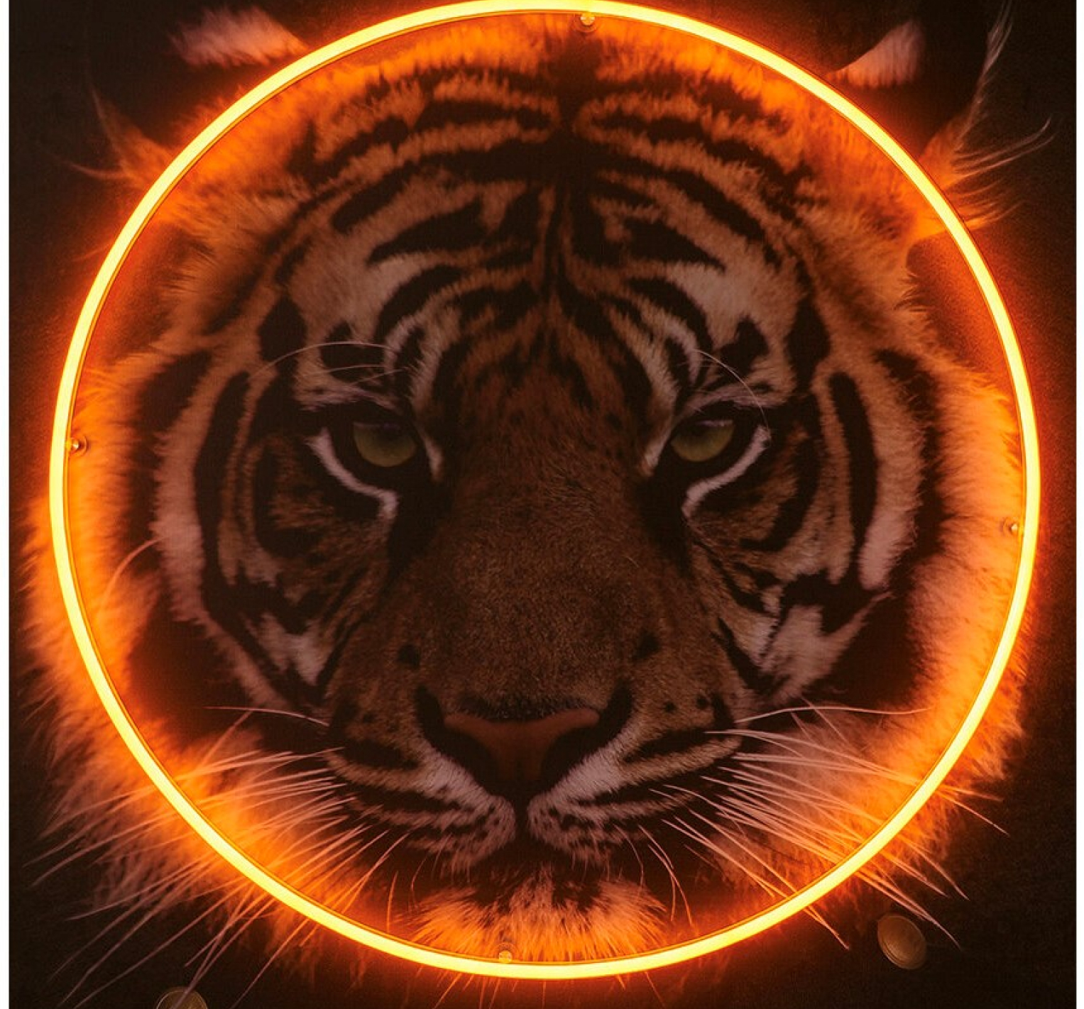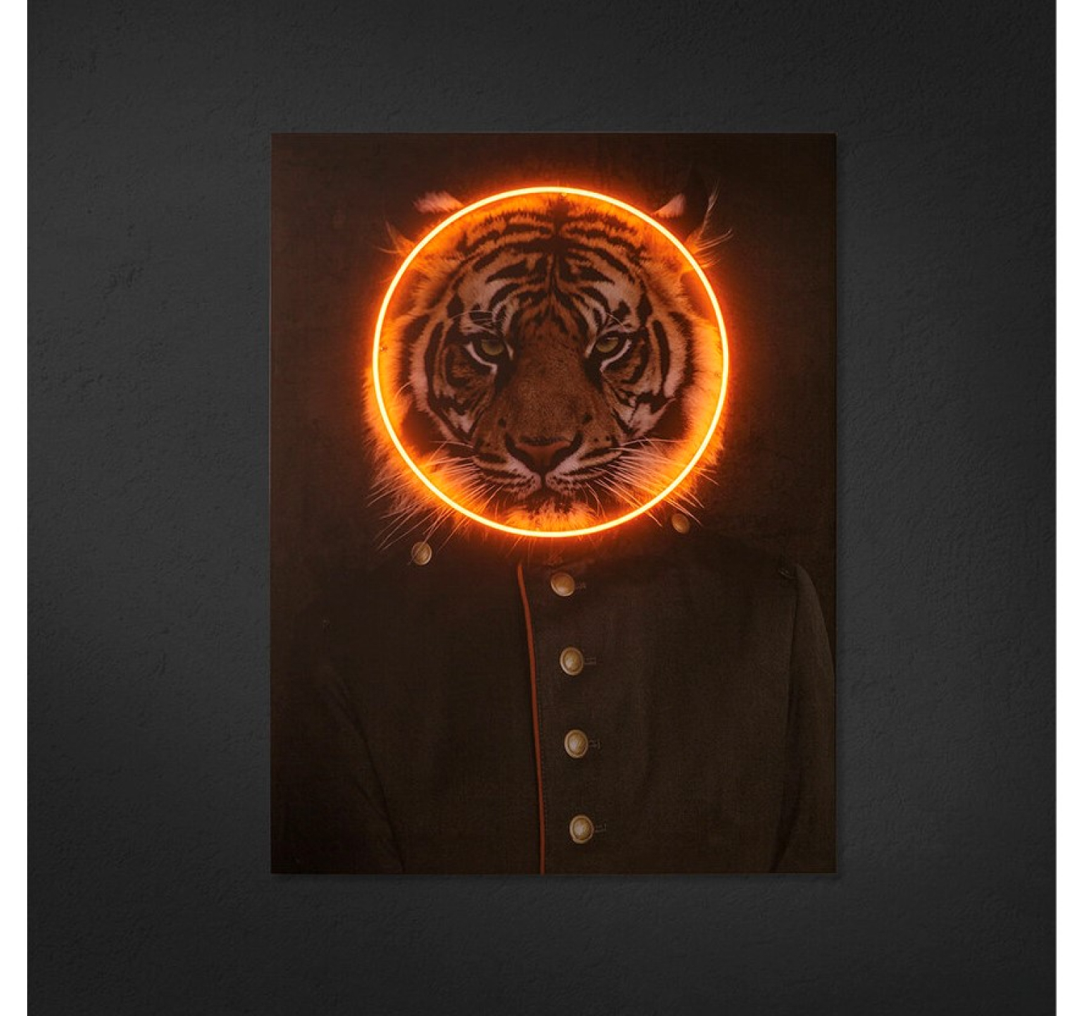 Панель с принтом в виде тигра в старинной солдатской униформе. Вокруг головы животного установлена меняющая цвет LED-подсветка, создающая эффект нимба.