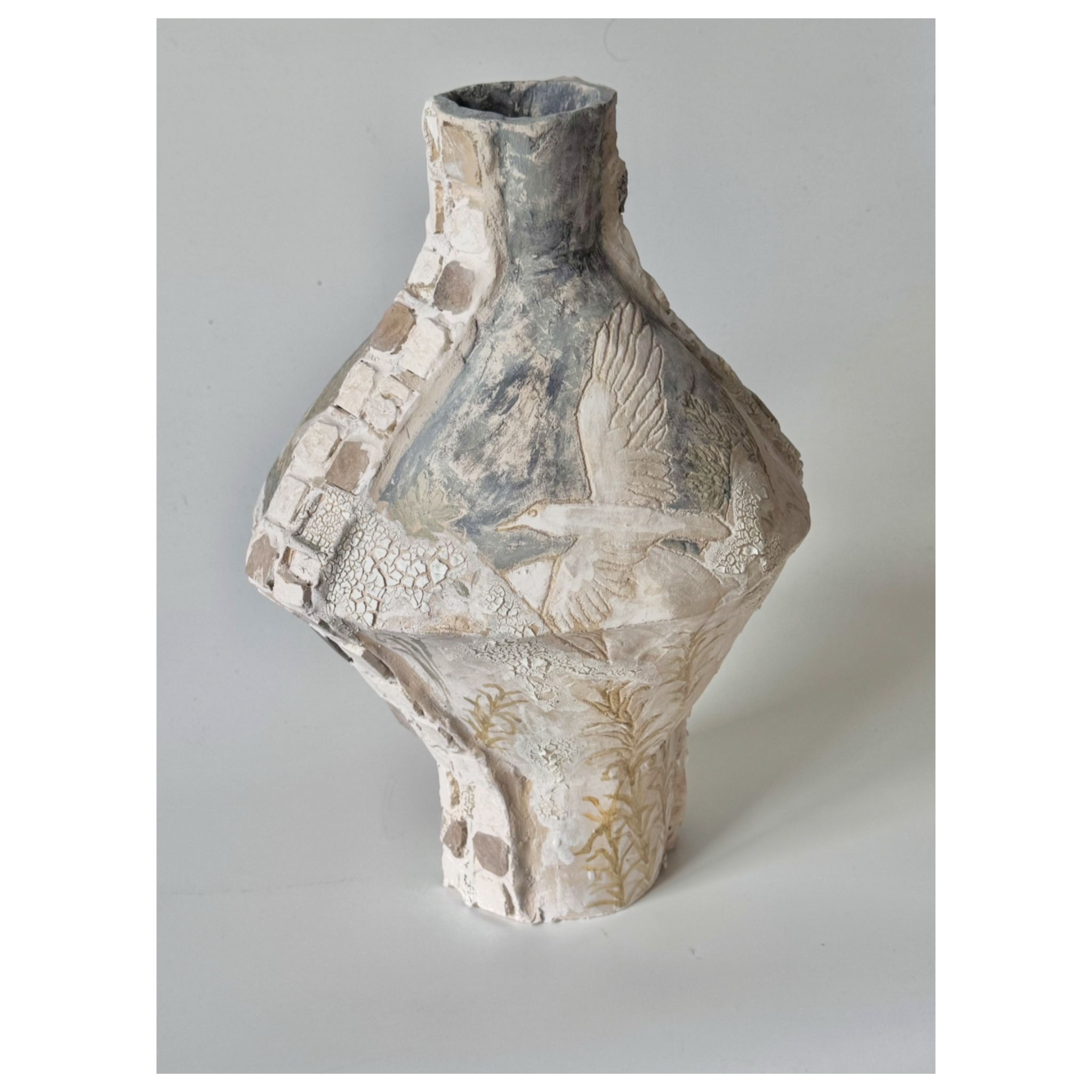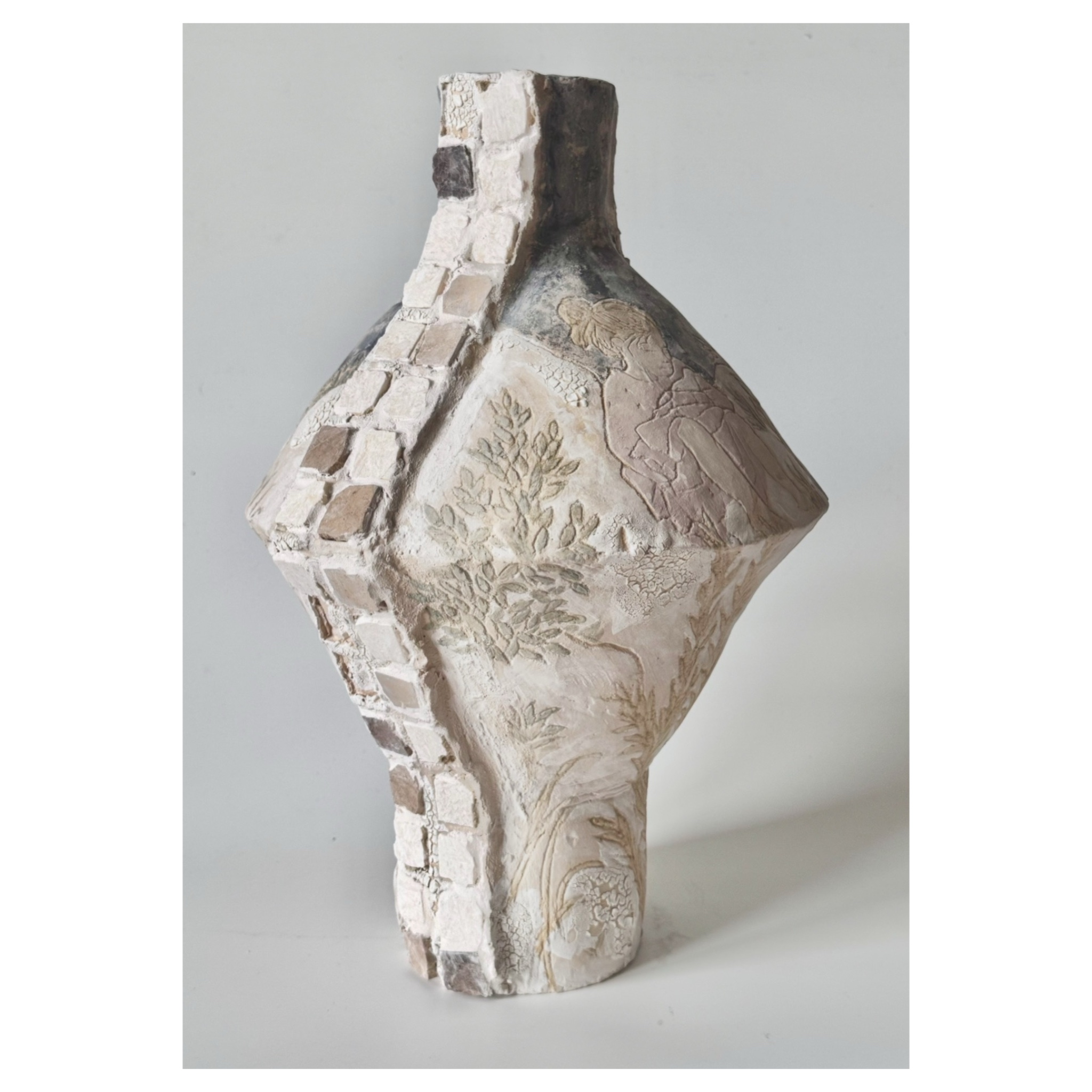 Ваза выполнена для новой серии «Истоки и течения», над которой автор работает в 2025 году. Лена Марру имеет образование в области монументальной живописи, и работает с древними техниками фрески по извести, мозаике и сграффито. Последние несколько лет проводит исследование в области древней живописи , изучая сохранившиеся фрески и архитектуру храмов 11-15 веков. Автор последовательно посещала храмы в новгородской области, Ферапонтово, Звенигороде, изучая и собирая по кусочкам техники, детали и знаки. Цель исследования- обозначить для себя основные элементы истоков родной культуры и внедрить древние техники в современное искусство. Вазы в новой серии выполнены в смешении техник сграффито, фрески, мозаики и керамики, это возможность слить в едином образе множество деталей , отражающих дух культурного кода.