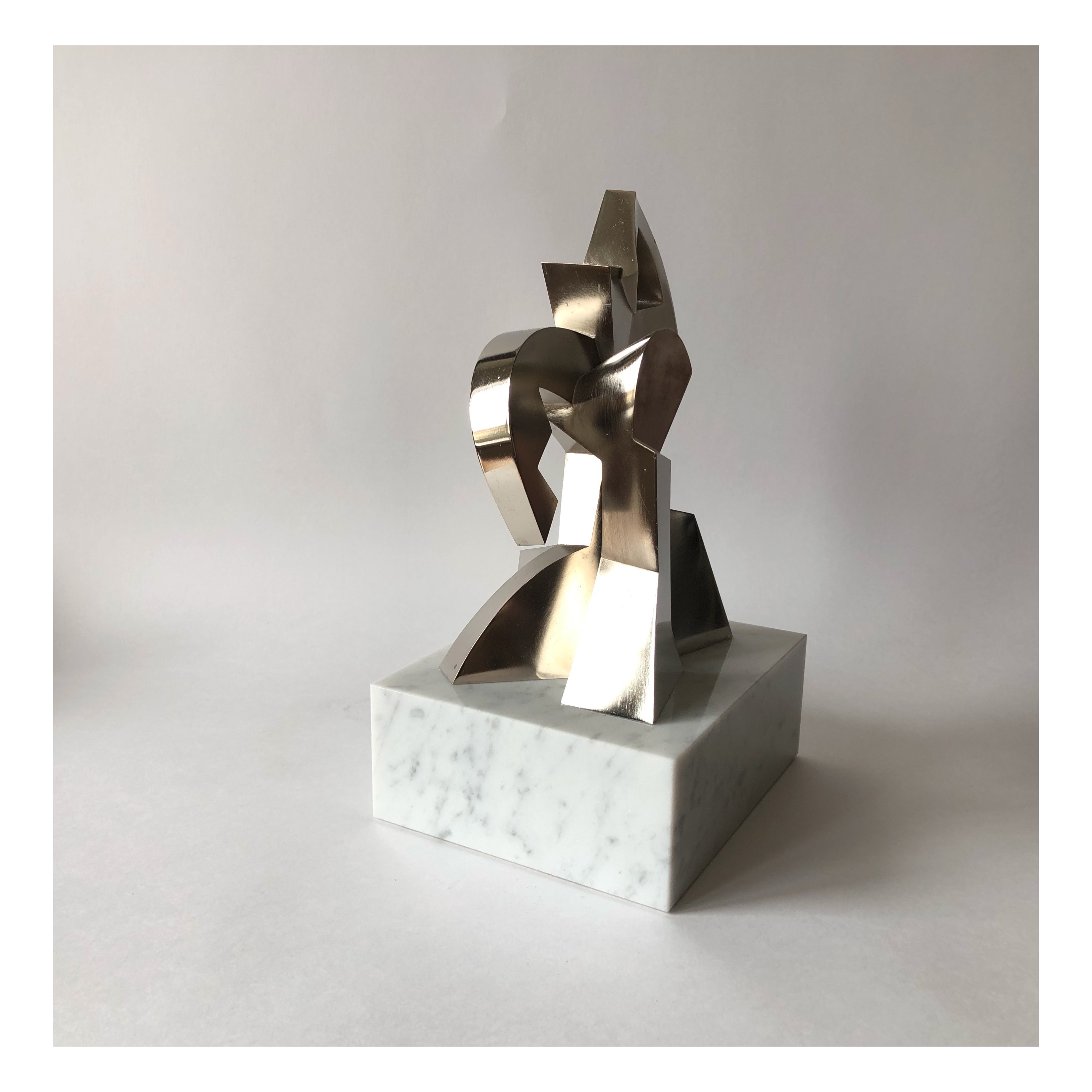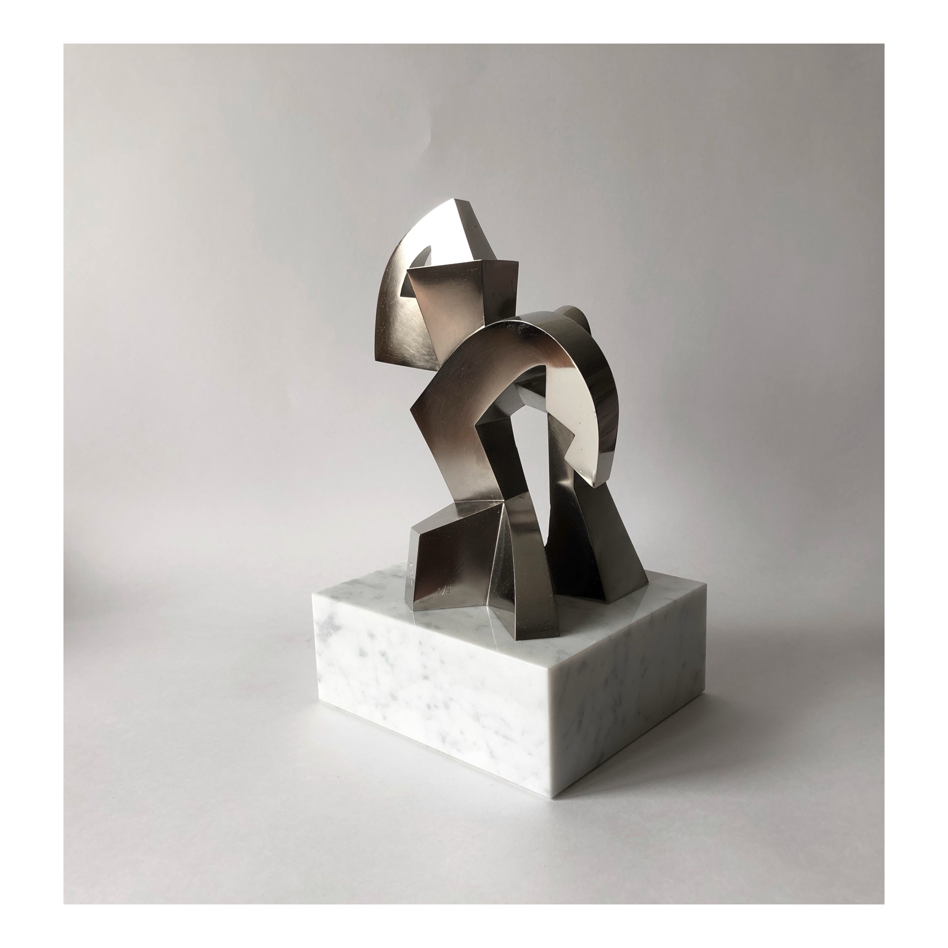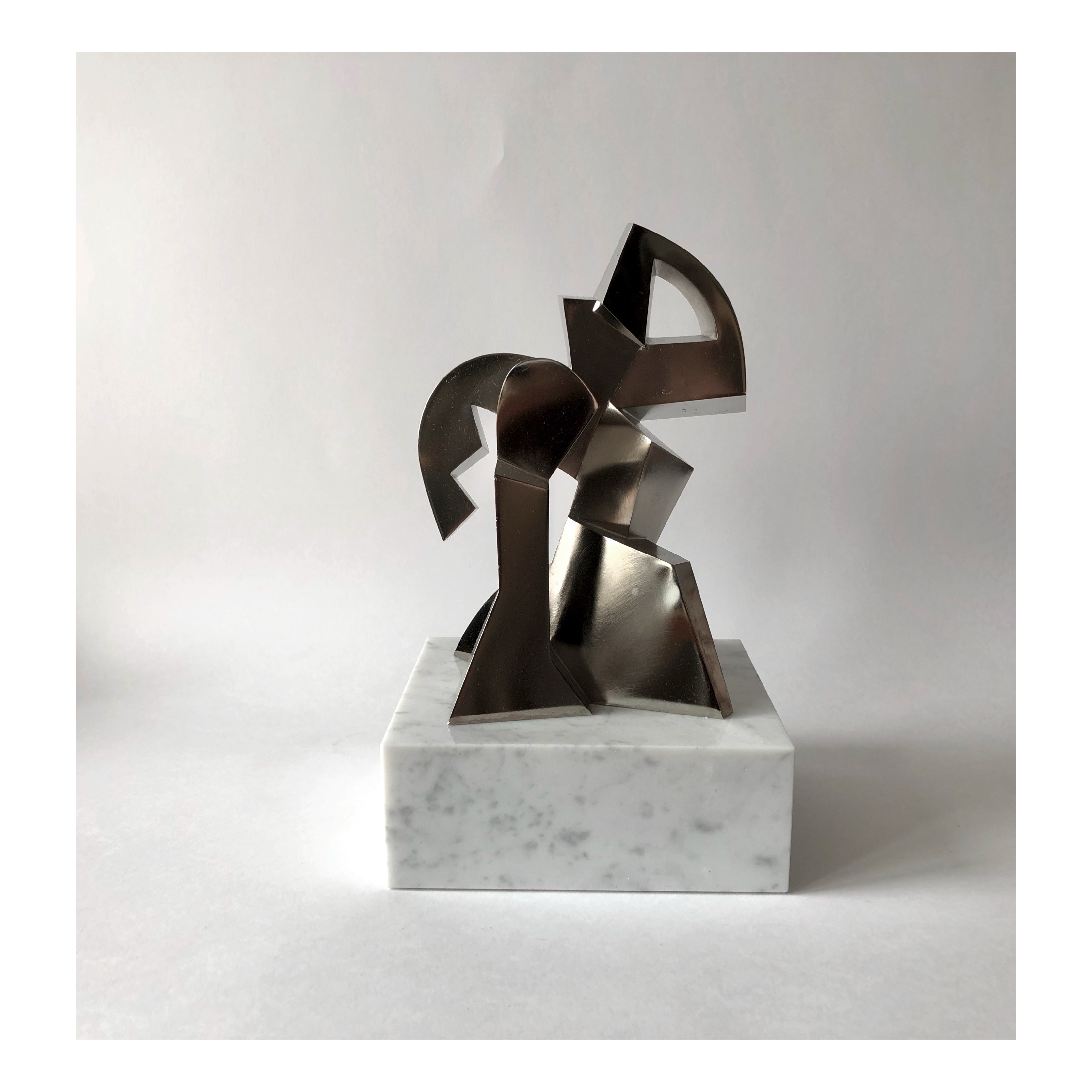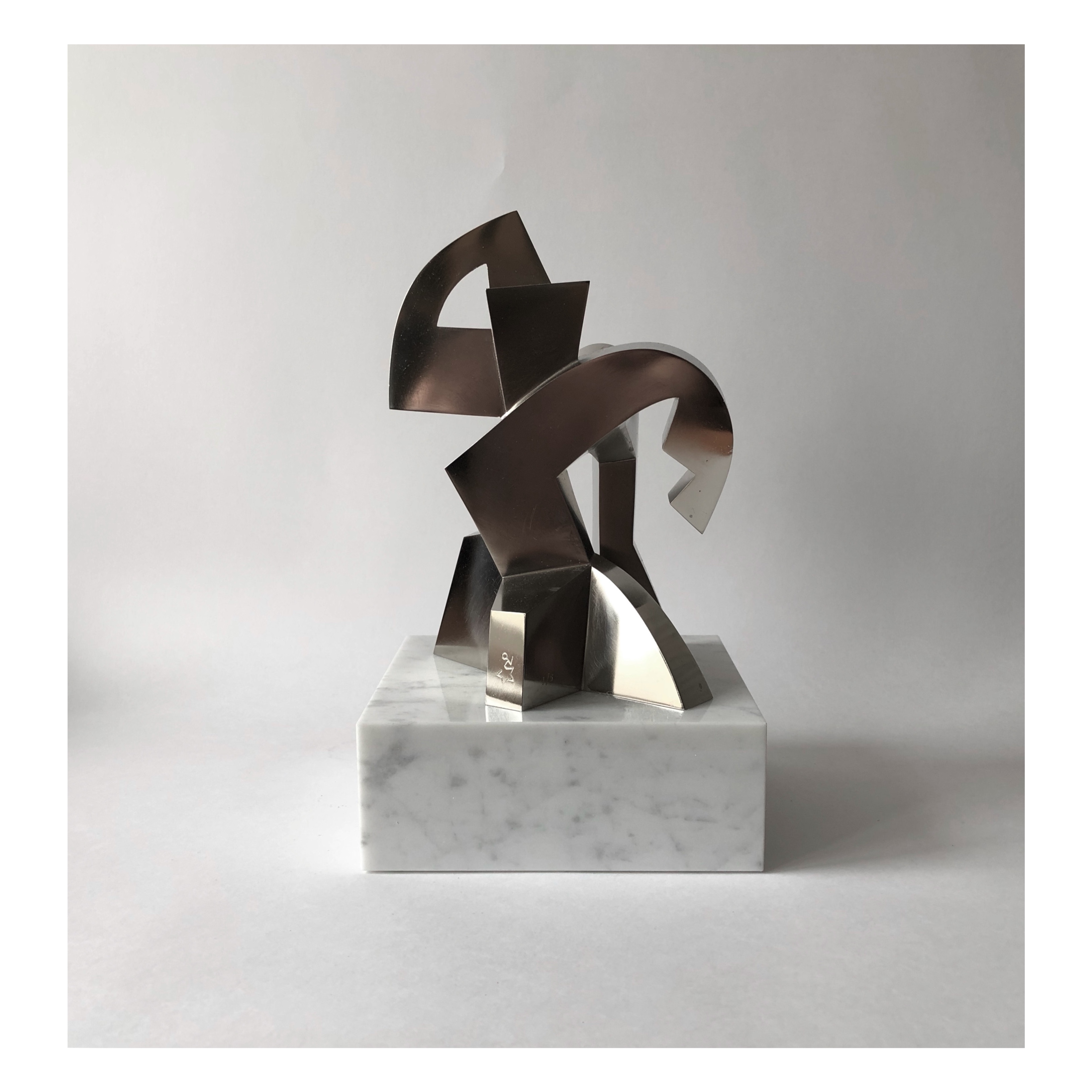 Взаимосвязь энергичных, проникающих объемов, с чистыми линиями, обнаруживает непрерывный ритм. Происходит закономерное превращение пластическогообраза фигуры в объемный знак. Автор предлагает свое решение постоянного вопроса скульптуры - соотношения масс и пустот между собой и в пространстве.
