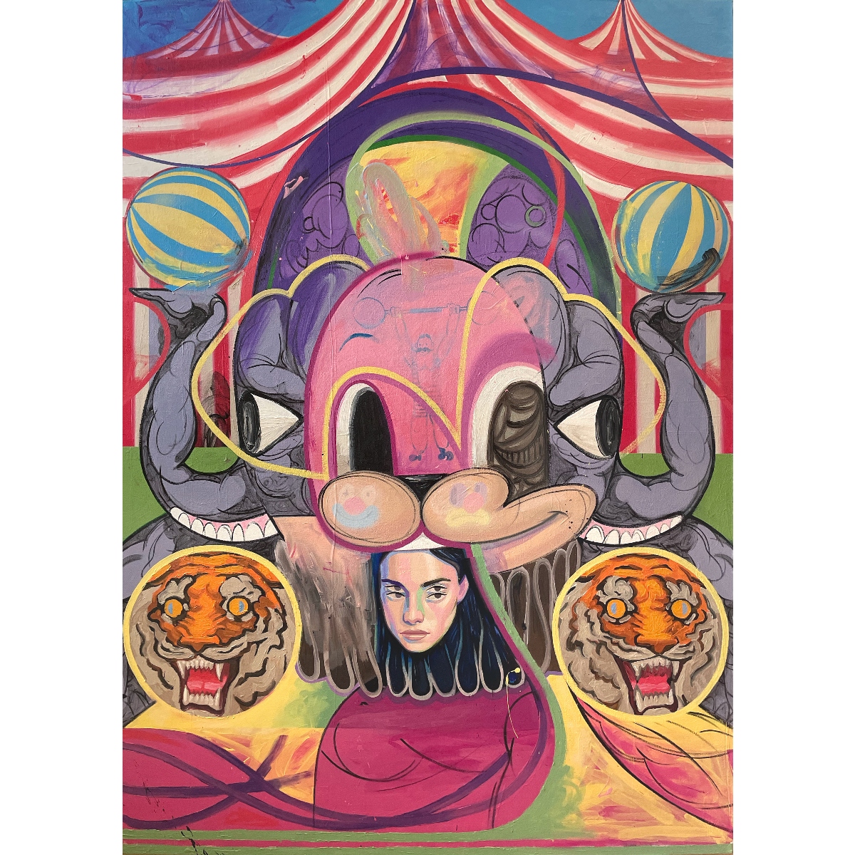 Как часто перед сном вас захватывает поток навязчивых мыслей — сменяющих друг друга, словно кадры в бесконечной проекции? Воображение начинает работать автономно, создавая странные, порой абсурдные сценарии, лишь отчасти связанные с реальностью. В условиях нарастающего информационного шума, стремительного развития технологий и алгоритмов формируется особое состояние — фоновая тревожность, ставшая неотъемлемой частью современного опыта. Это тихое, но масштабное явление влияет на то, как мы думаем, чувствуем и воспринимаем будущее. Не случайно психотерапия превратилась в один из символов нашего времени. Под воздействием внешних факторов воображение способно конструировать настолько яркие и убедительные образы возможного будущего, что реальность постепенно отступает на второй план. Этот механизм лежит в основе серии “Weird Thoughts”. Её персонажи словно растворяются в собственных фантазиях: их силуэты размыты, в то время как воображаемые миры обретают плотность, насыщенность и визуальную выразительность. Художественный язык серии строится на контрасте — между блеклой, ускользающей реальностью и гипертрофированным, эклектичным пространством внутренних образов. Здесь страхи обретают форму: кто-то, охваченный тревогой перед катастрофами, населяет свои мысли чудовищами, сжигающими города; кто-то, одержимый идеей вечной молодости, мчится в фантазийном кабриолете-пилюле сквозь ландшафты собственного сознания. В этих сюжетах легко узнать себя. И, возможно, благодаря намеренно насыщенной, местами наивной живописной манере, зритель получает шанс отстраниться, взглянуть на свои тревоги со стороны — и затем вернуться к реальности, к её подлинной, живой и многослойной палитре.
