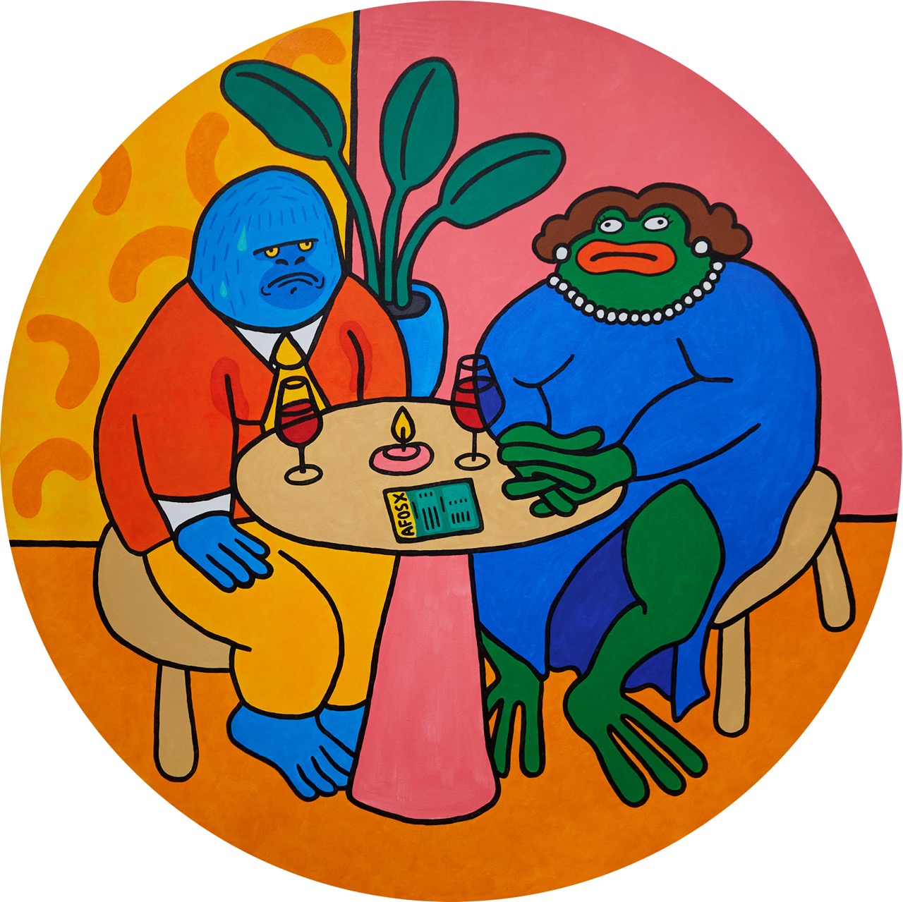 Принятие кринжа прошлого. Лучше не прокручивать в голове лишний раз то супер неловкое свидание, где пота выделялось больше, чем слов из ваших уст. Картина не для слабонервных. Работа была показана на персональной выставке Екатерины Ходыревой / Afos X «Принятие». Экспозиция познакомила зрителей с авторской вселенной STONED ANIMALS, наполненной яркими и ироничными персонажами. Каждый из героев проживает порой нелепую, но всегда захватывающую жизнь, иллюстрирующую личный опыт и приключения художницы. На выставке была представлена новая серия работ, посвященная теме принятия – себя, других и происходящего вокруг. Для художницы принятие – завершающий этап личного развития, который меняет точку зрения и вдохновляет на новые свершения.